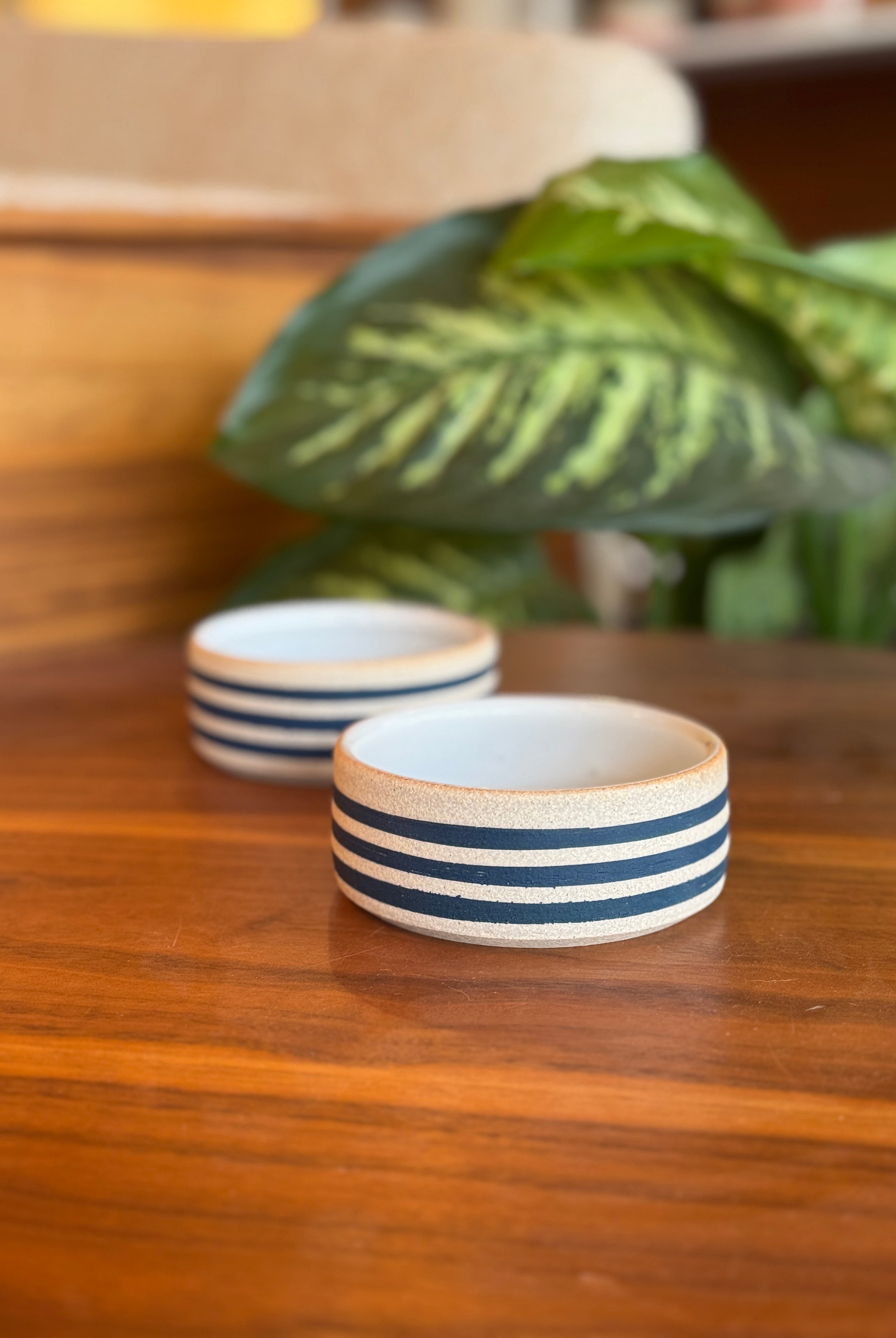 Stripes are hand brushed on the potters wheel. Each piece glazed with meticulous precision.