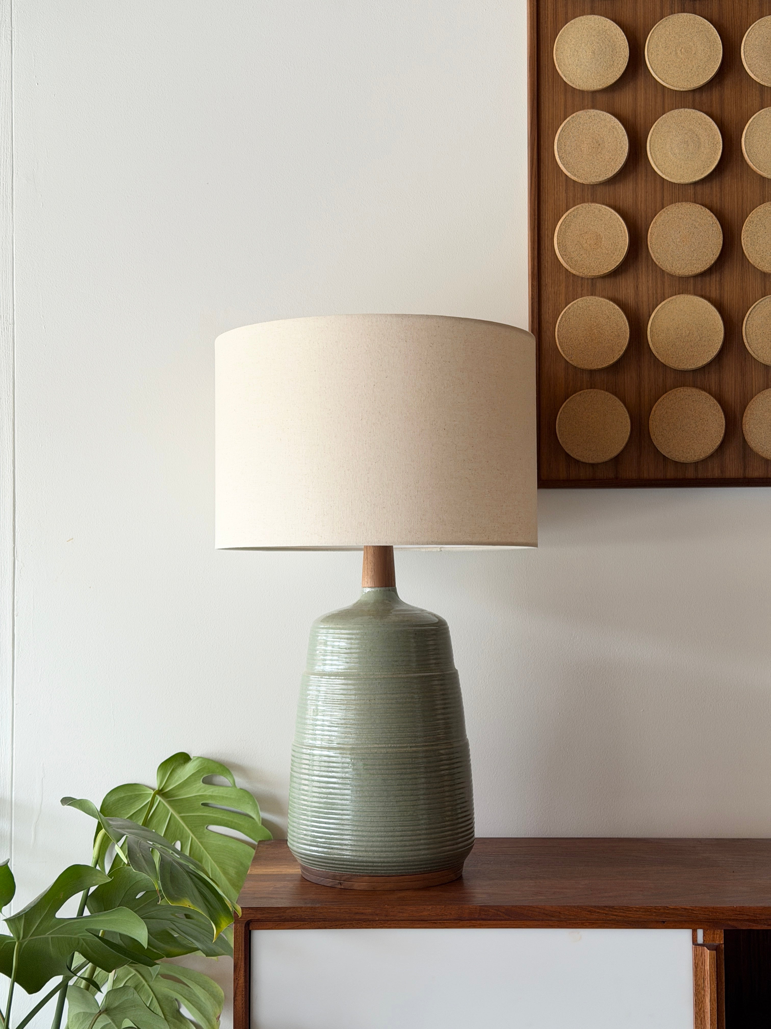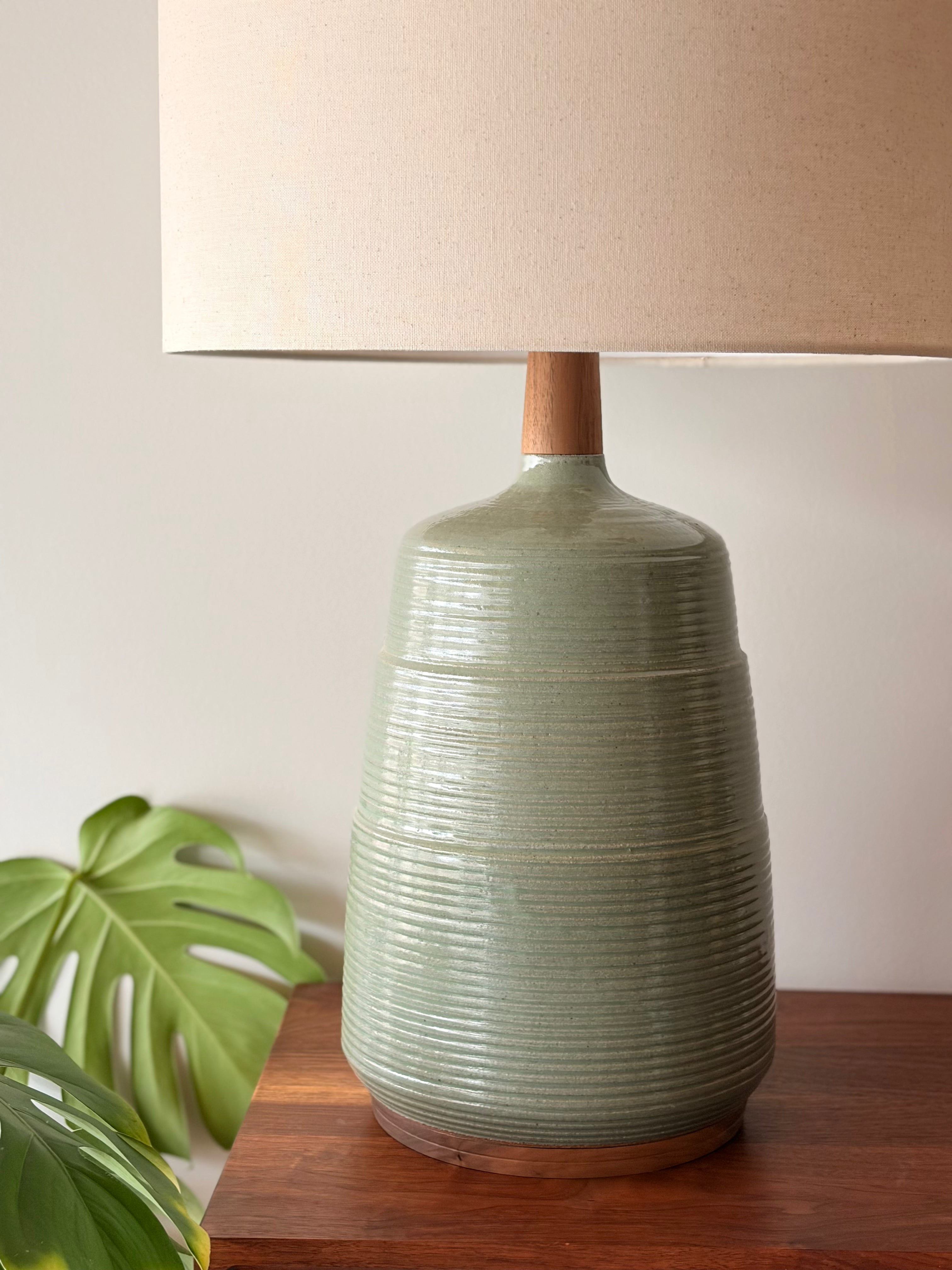 We utilize solid walnut, white oak, teak and rosewood to hand turn each neck and base of our lamps on the lathe.