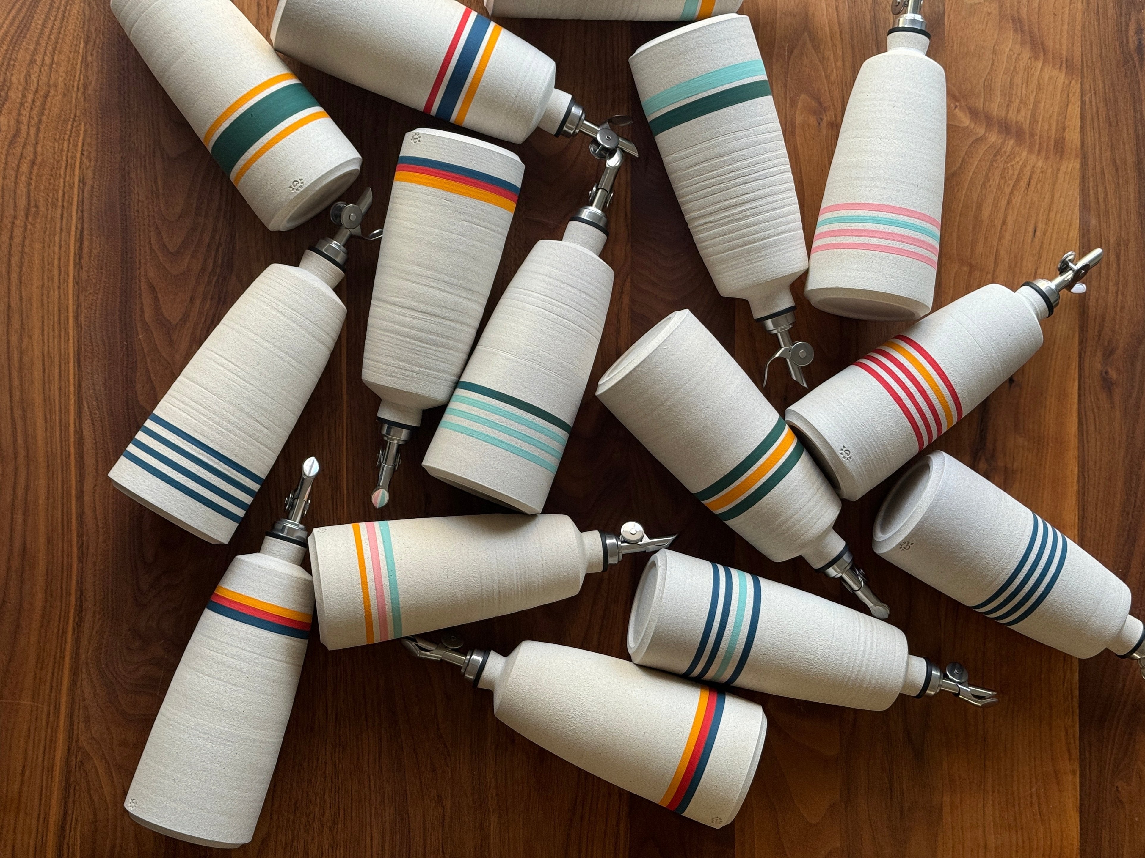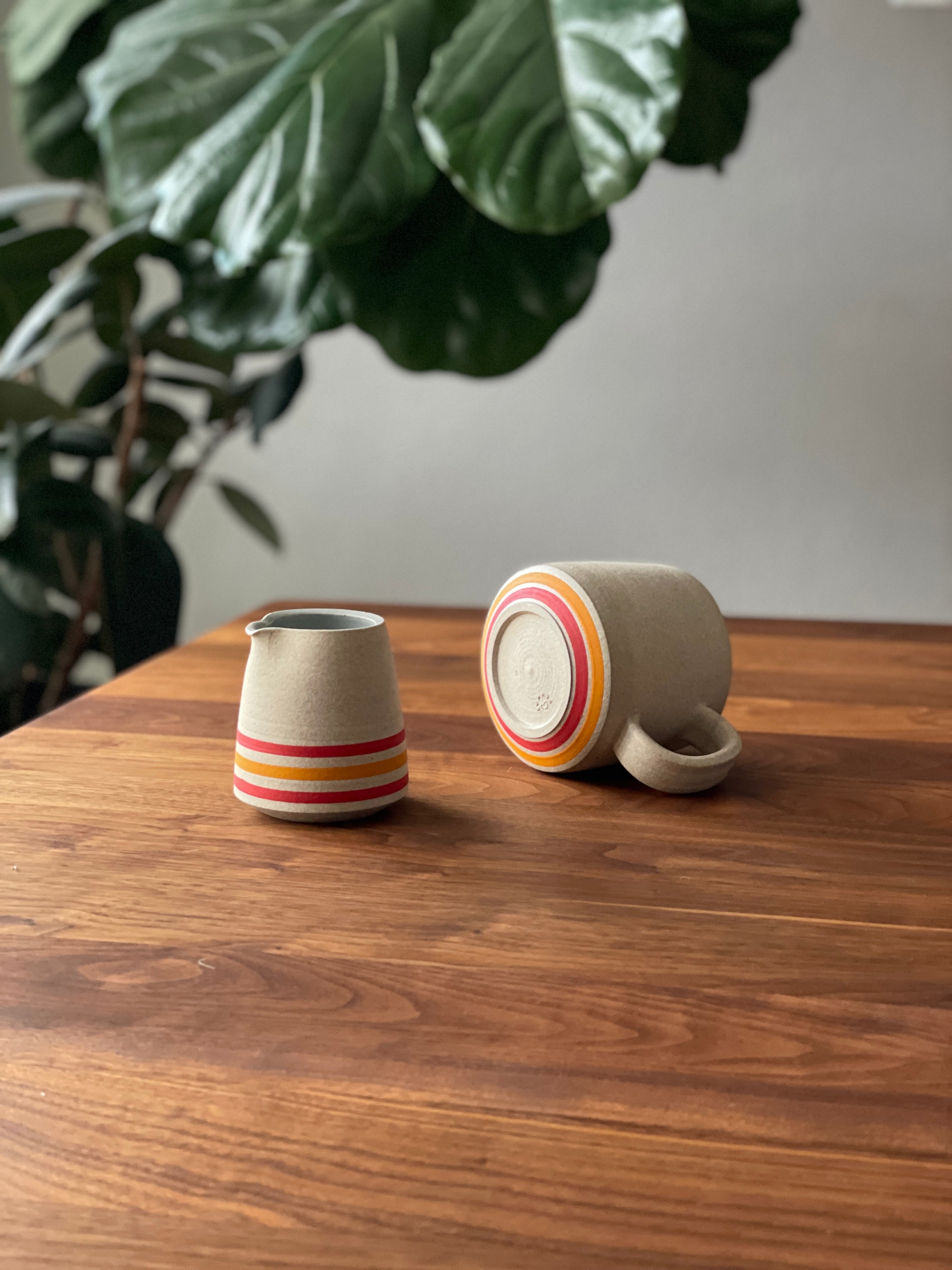 Stripes are hand brushed on the potters wheel. Each piece glazed with meticulous precision.