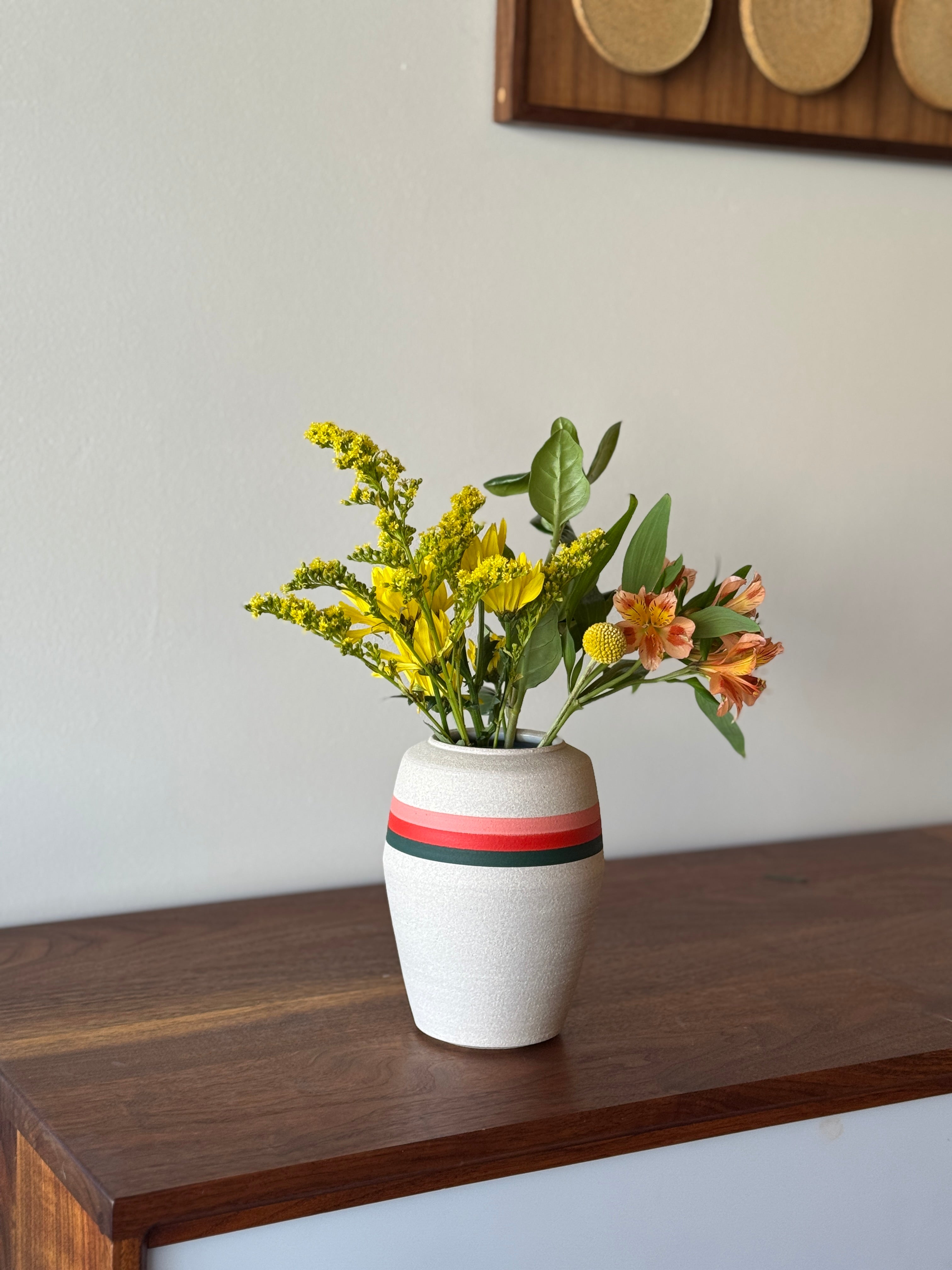 A stem vase, perfect for any occasion. Rich navy and guava pink stripe offers a unique color combination to finish the space.