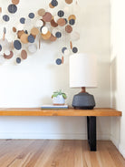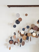 Individual ceramic discs are each tied onto our handcrafted double bar walnut mount, creating a remarkable wall installation. The ceramic and wood pair perfectly to create a unique element in the home.