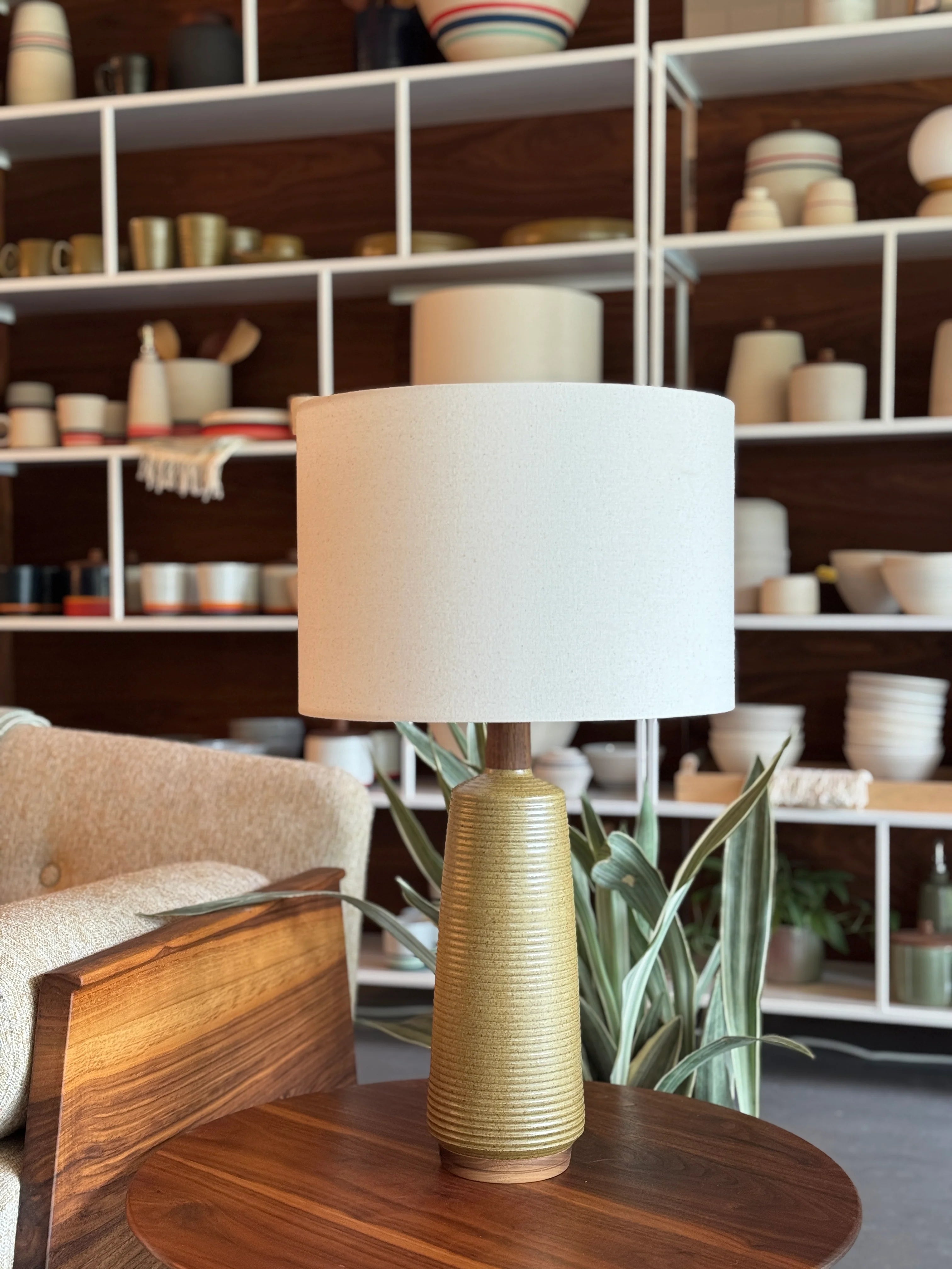 Tall and sculptural, this modern lamp is flexible and timeless in design. One of our favorite designs to throw on the wheel, and a classic mid century shape. This one feels like "the standard" to us, but that doesn't make it boring. Some of our very favorite glaze combinations lend so well to this form.