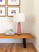 Long, straight lines and sculptural form with detailed woodwork define this unique and modern table lamp. Purposefully made to draw your eye to the most delightful details in the throwing process.