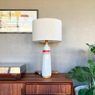 Long and slender, this stunning modern table lamp brings life to your space. Its sophisticated silhouette and detailed teak neck and base make it a true statement lamp.