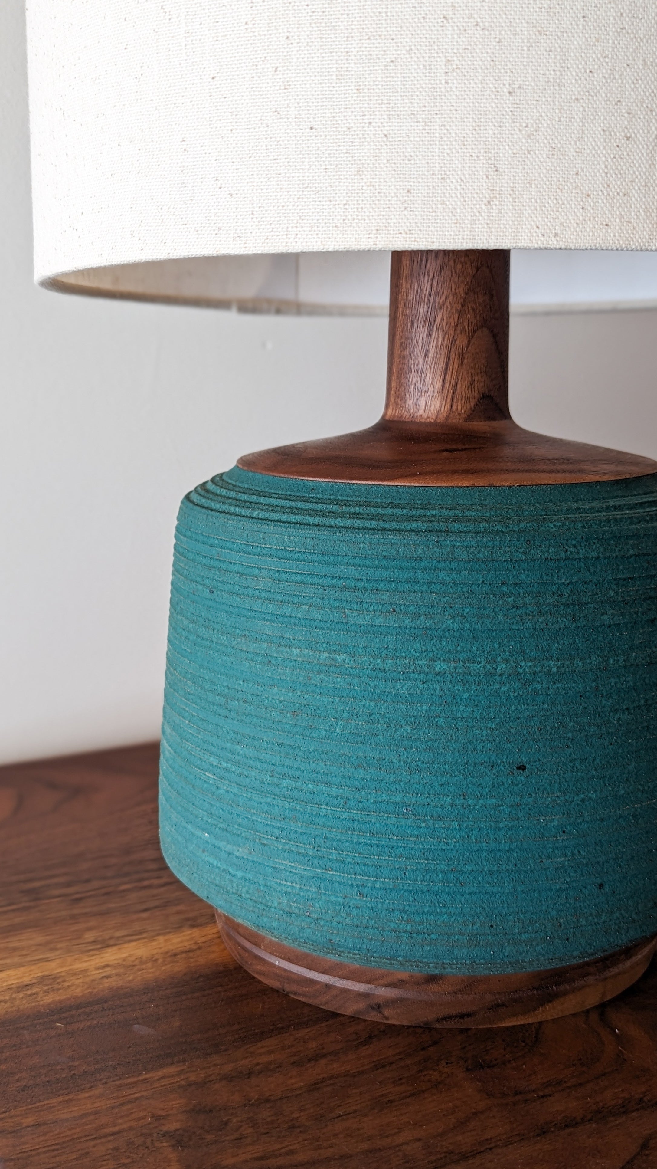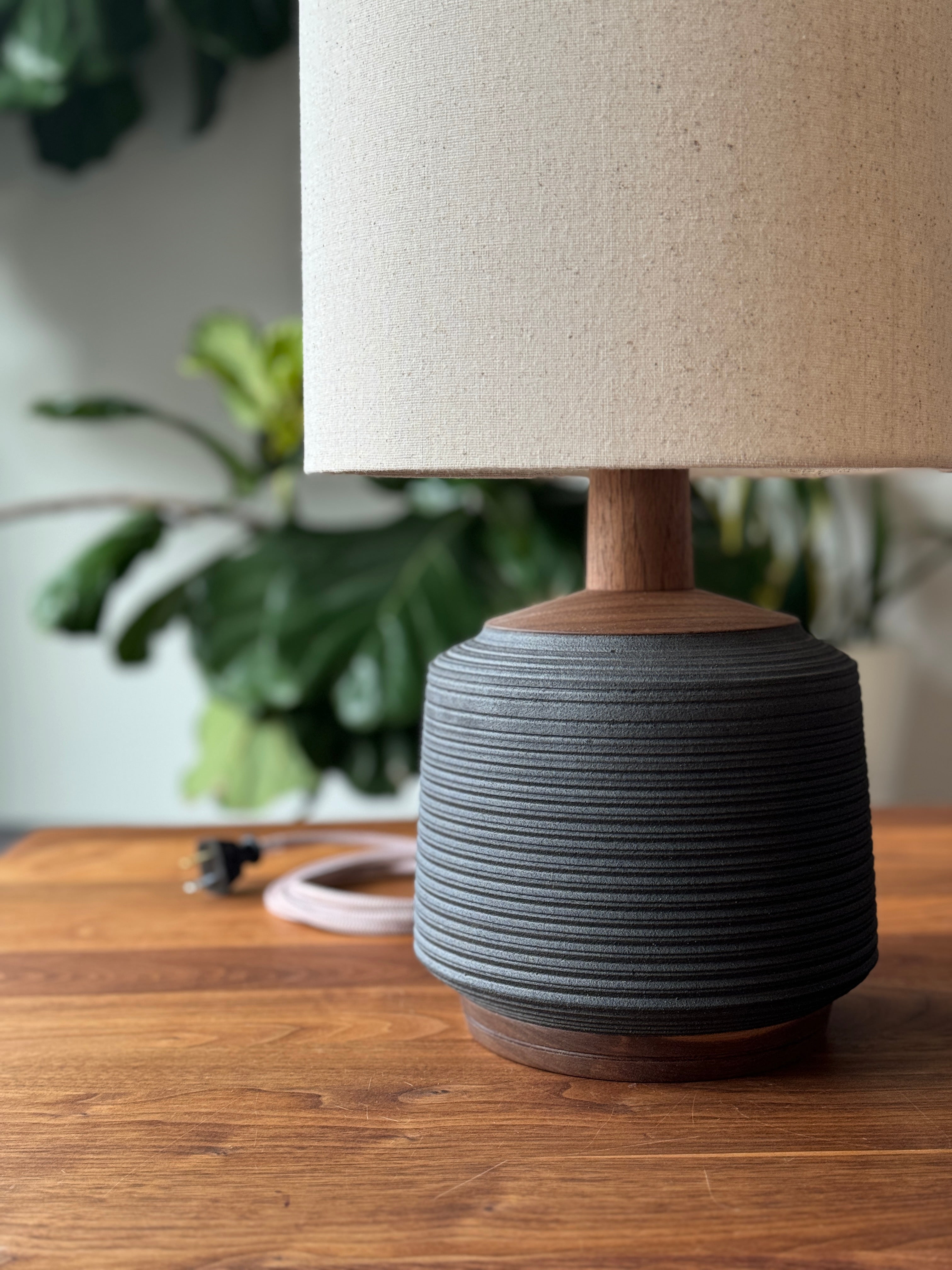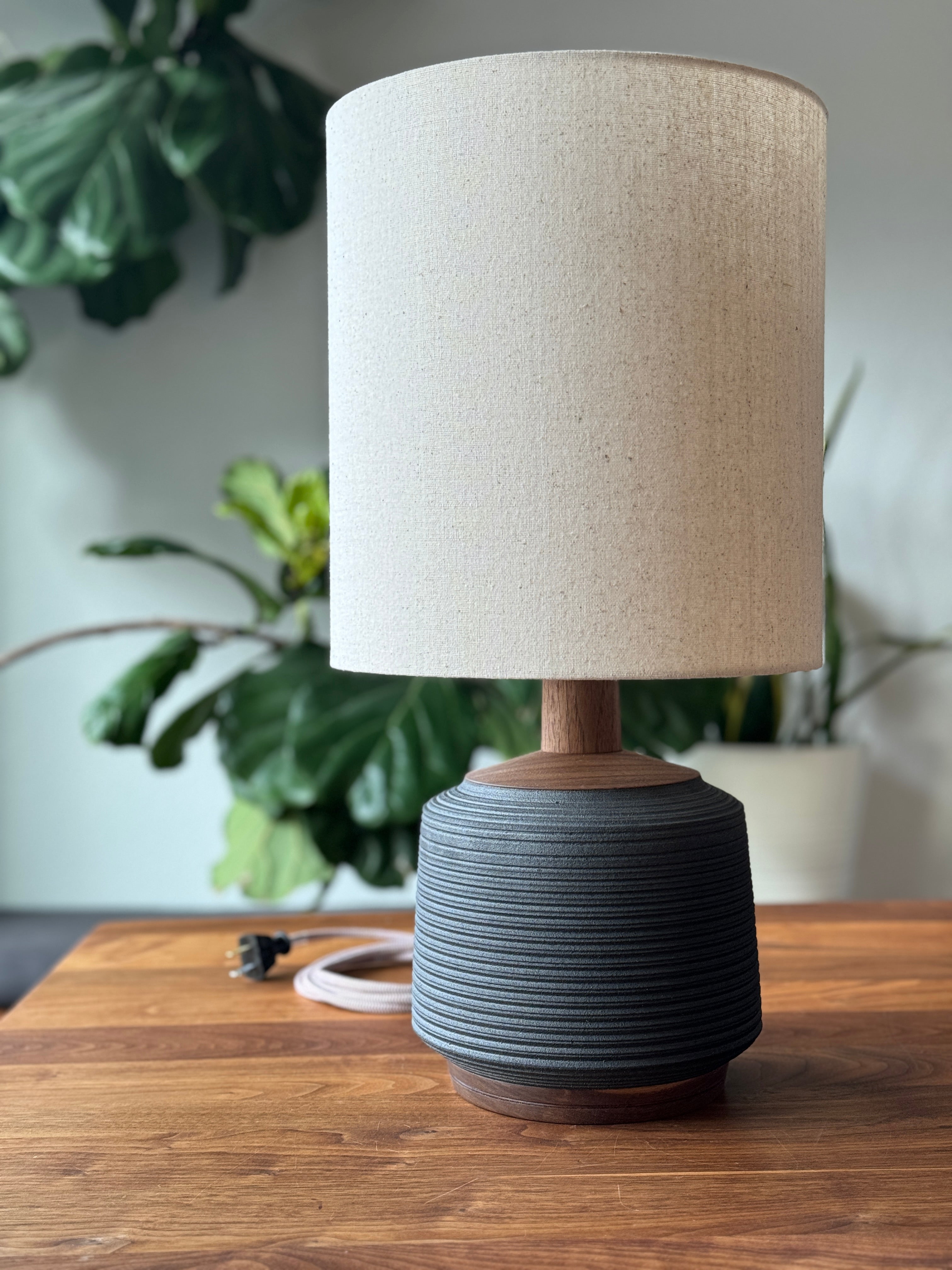 The perfect desk lamp for everyday use, this modern lamp highlights the natural beauty of the clay body, stunning woodwork, and occasionally some pops of color.