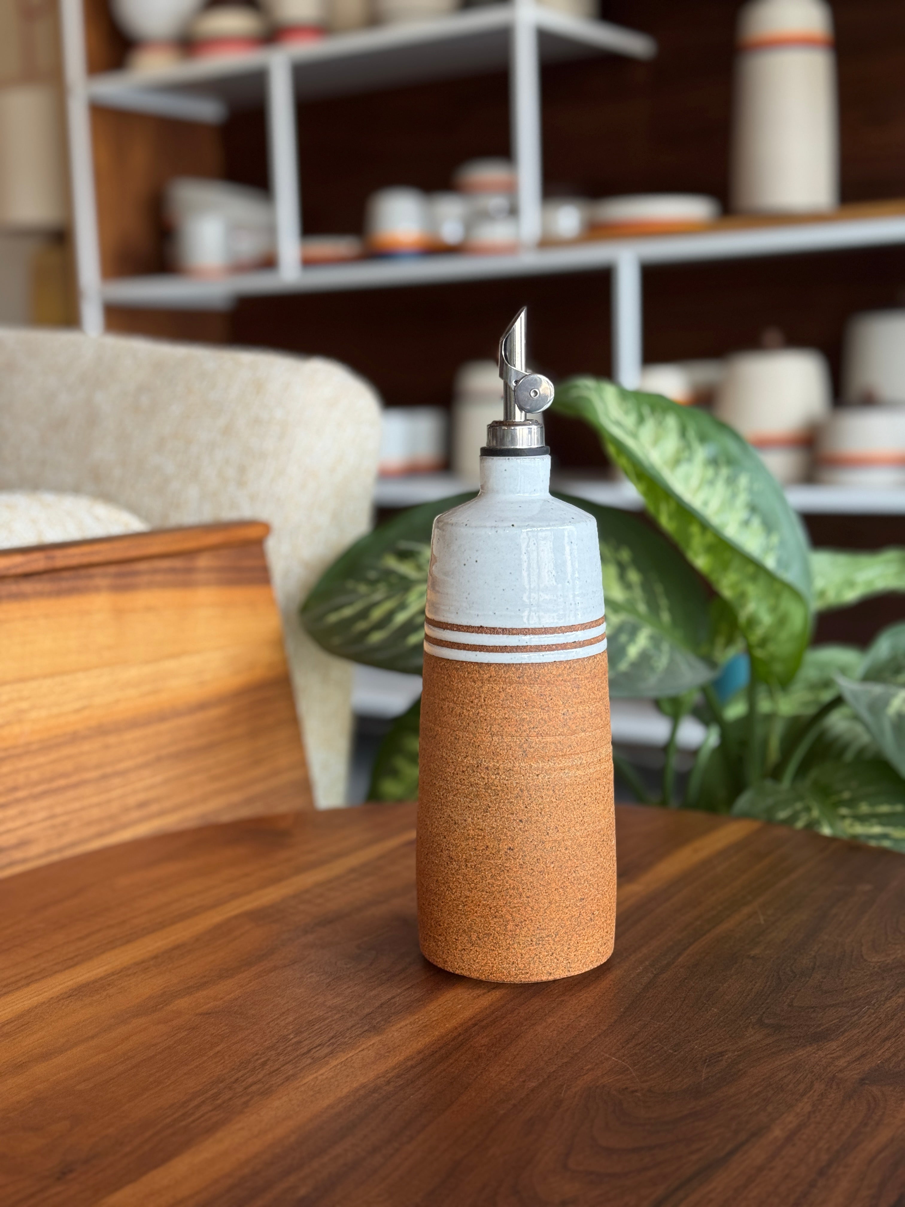 The perfect addition to any cooking routine. Made by hand on the potters wheel, this modern ceramic oil pourer is ideal to keep your oil, vinegar, or simple syrup fresh and easy to use. Microwave and dishwasher safe.