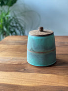 A kitchen canister you won’t have any second thoughts about leaving on the counter. Made by hand and then glazed with bronze green. Walnut lid has been handmade on a lathe to fit this specific canister perfectly.