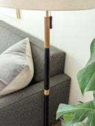 Minimal and clean design with stunning ceramic details and solid wood base. Modern with a small footprint, this versatile lamp is hand made of solid wood and stoneware in our Golden, Colorado studio. Finished with brass details, walnut pull chain, and fabric wrapped cord.