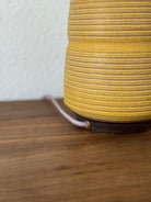 A mid-sized table or desk lamp, with a textured ribbed exterior covered in a deep yellow glaze and finished with hand-turned walnut neck and base. The smallest brass detail on the neck adds even another dimension.