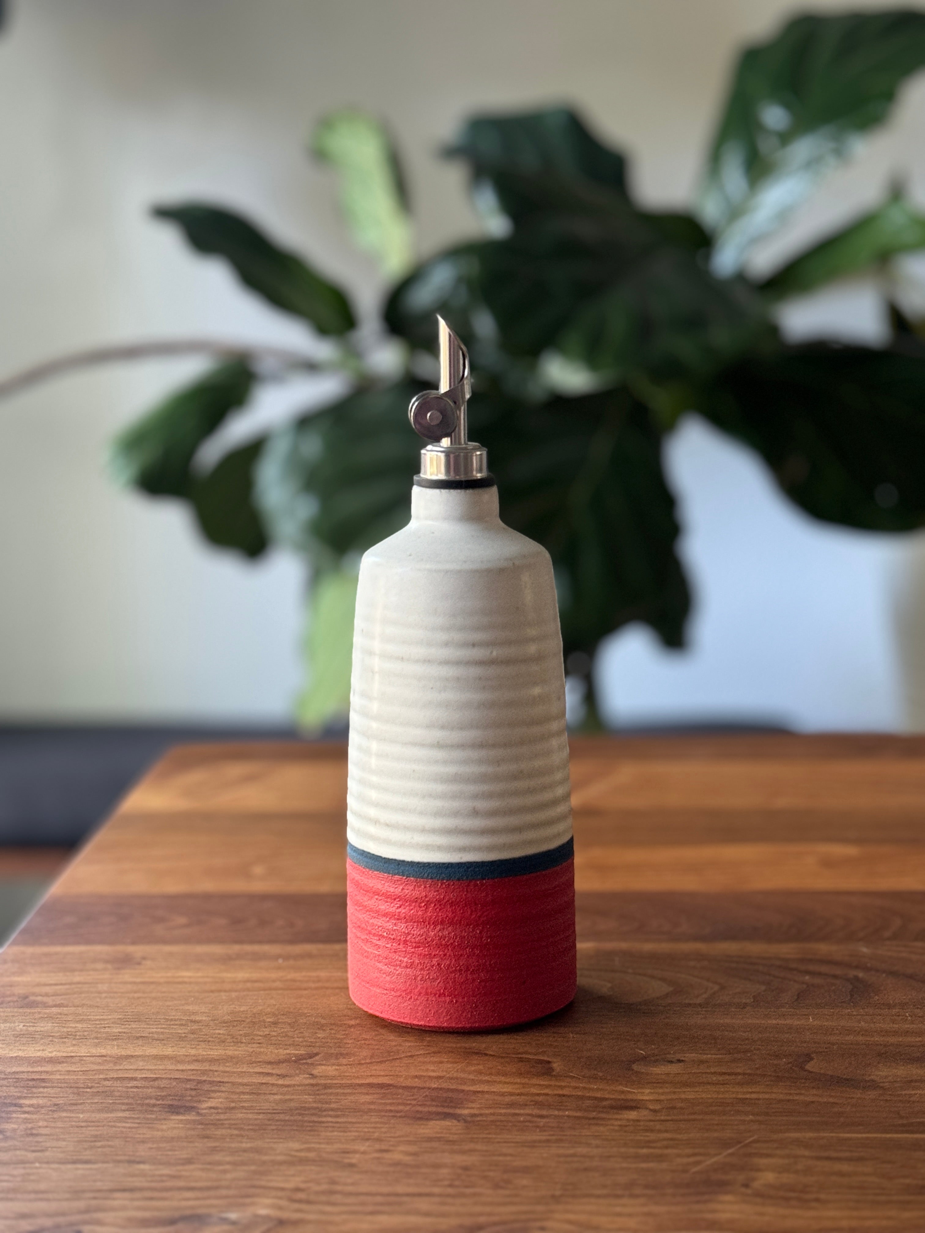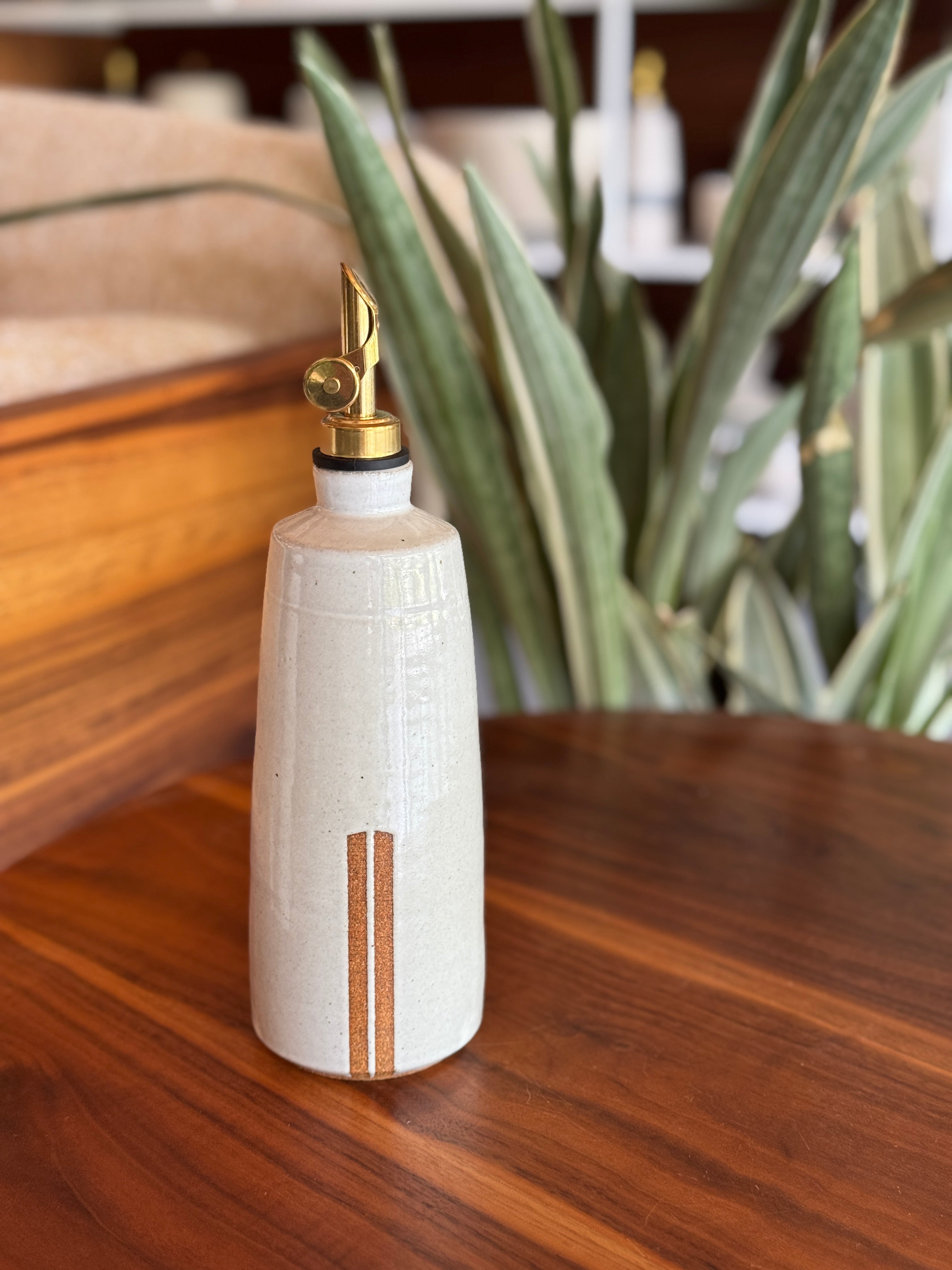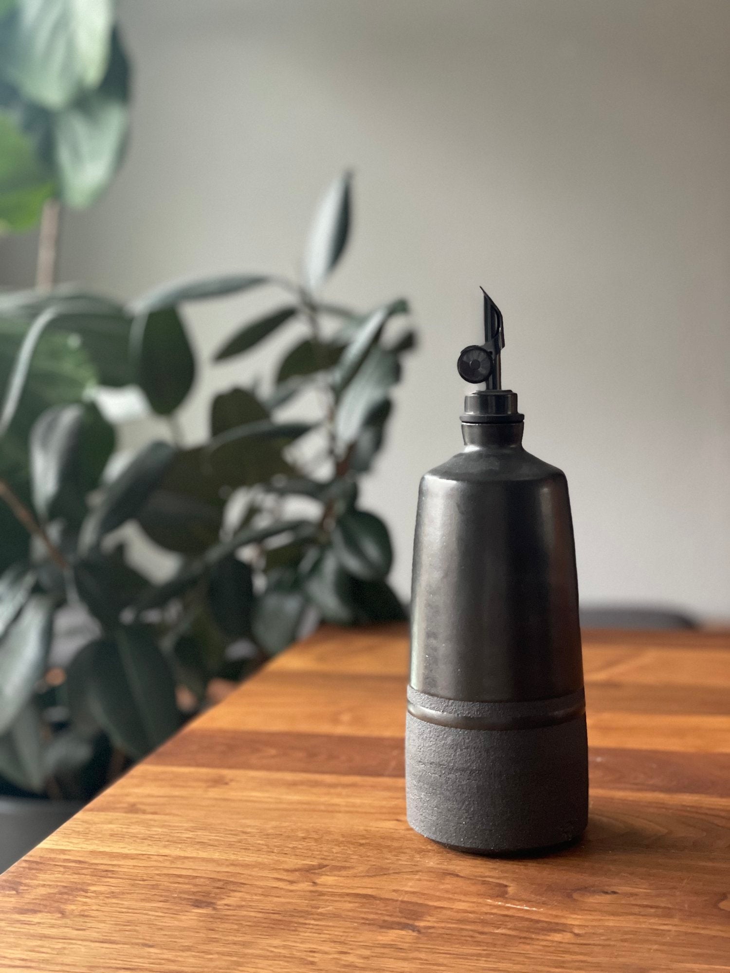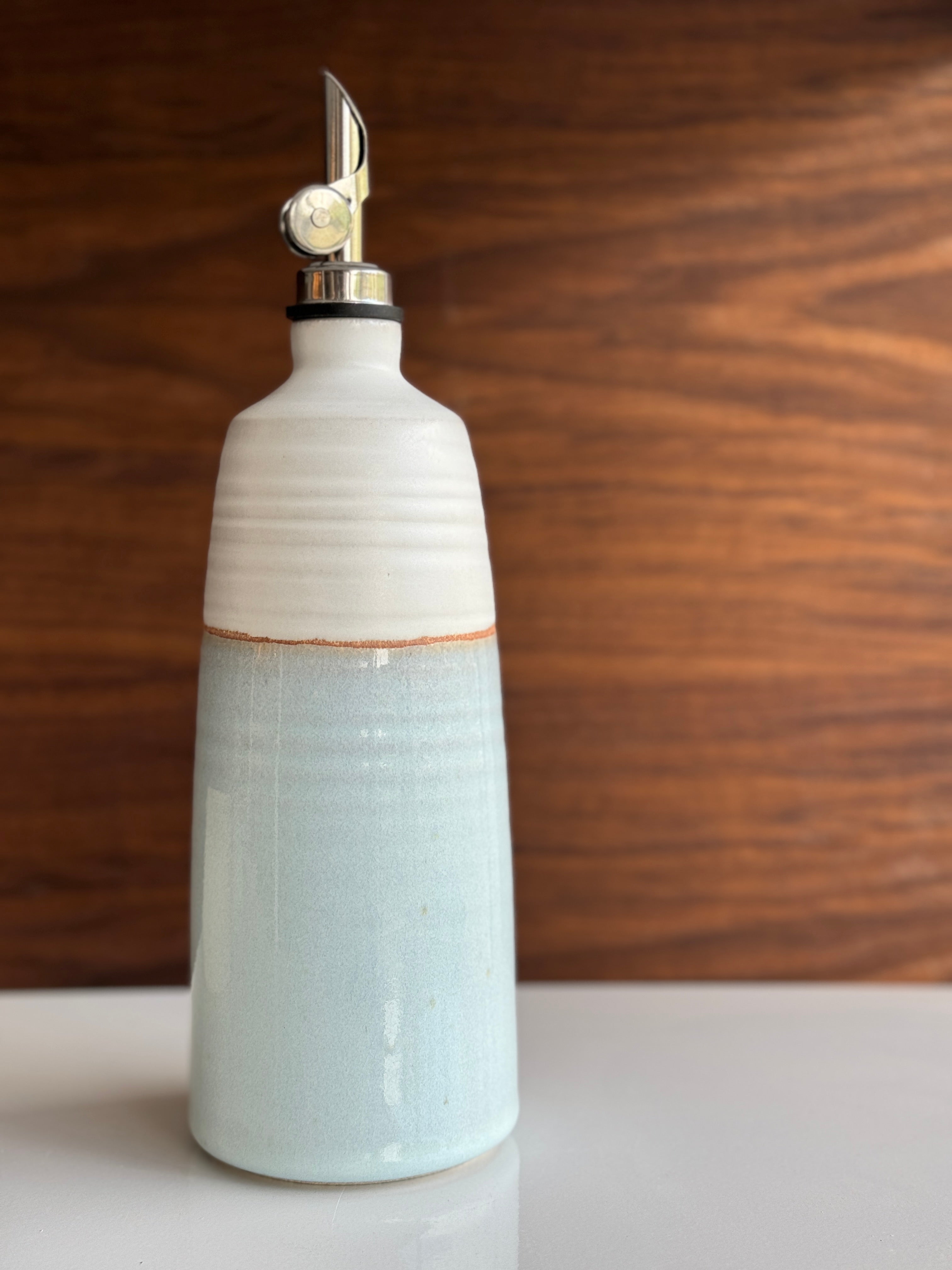 The perfect addition to any cooking routine. Made by hand on the potters wheel, this modern ceramic oil pourer is ideal to keep your oil, vinegar, or simple syrup fresh and easy to use. Microwave and dishwasher safe.