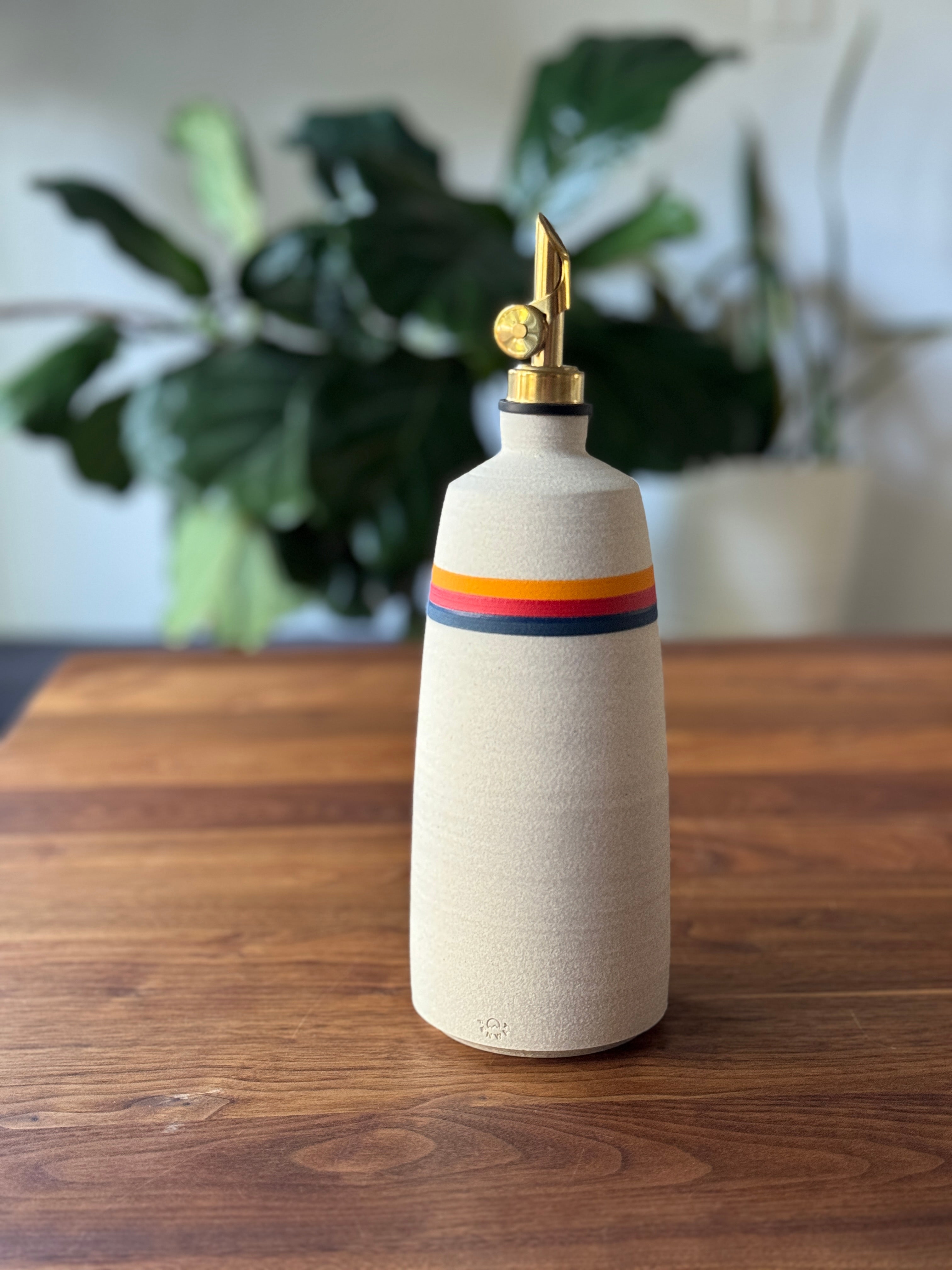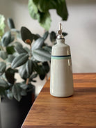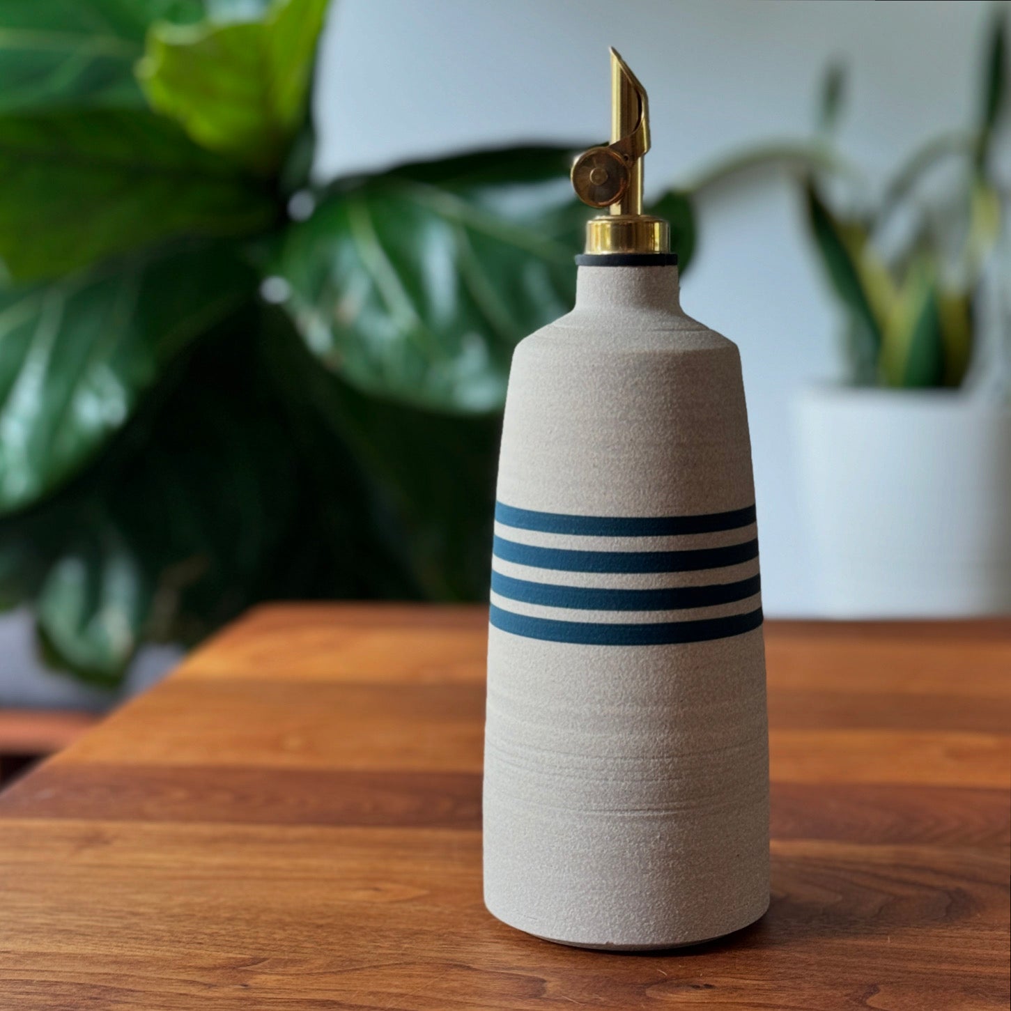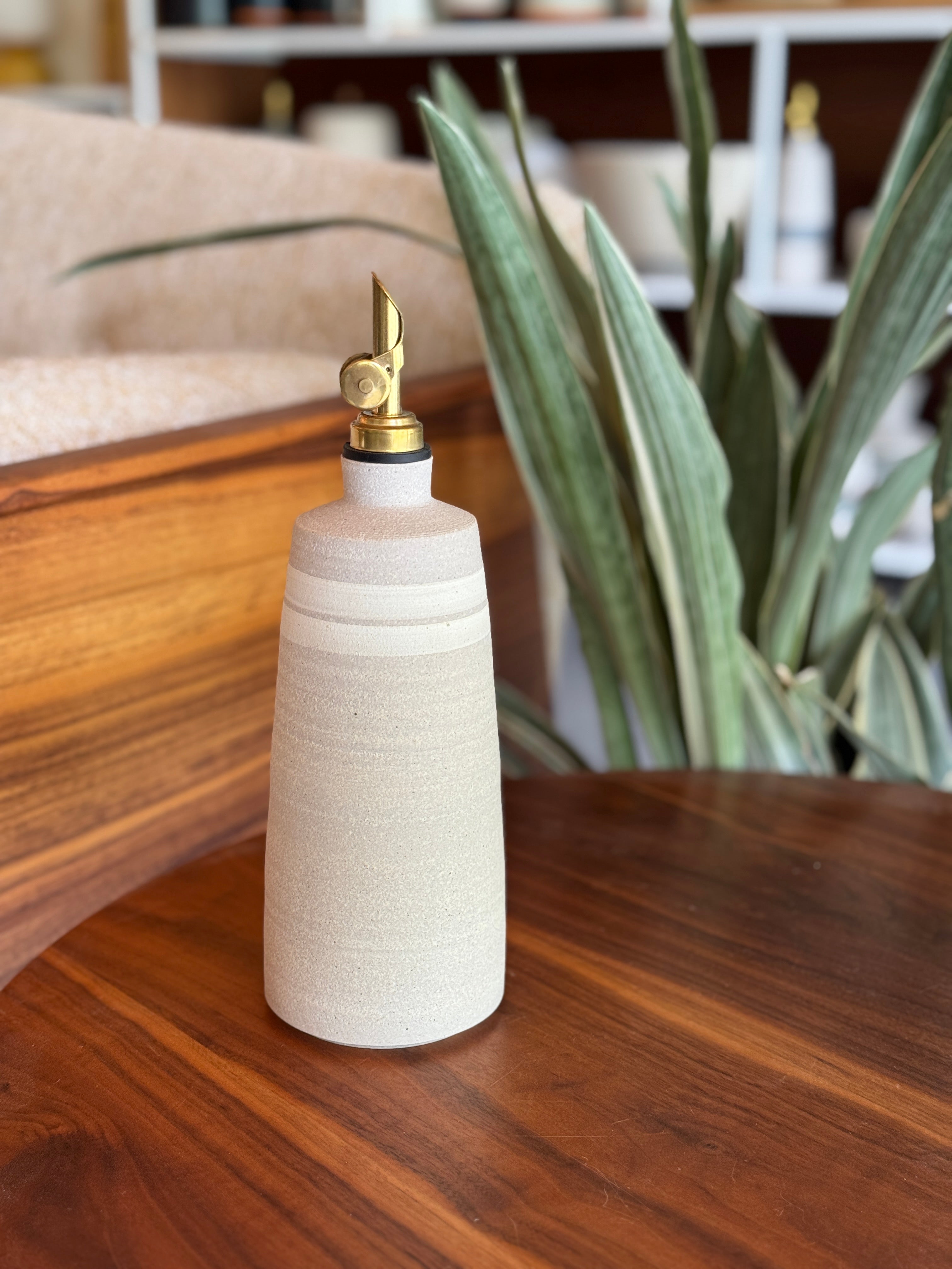 The perfect addition to any cooking routine. Made by hand on the potters wheel, this modern ceramic oil pourer is ideal to keep your oil, vinegar, or simple syrup fresh and easy to use. Microwave and dishwasher safe.