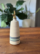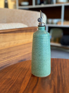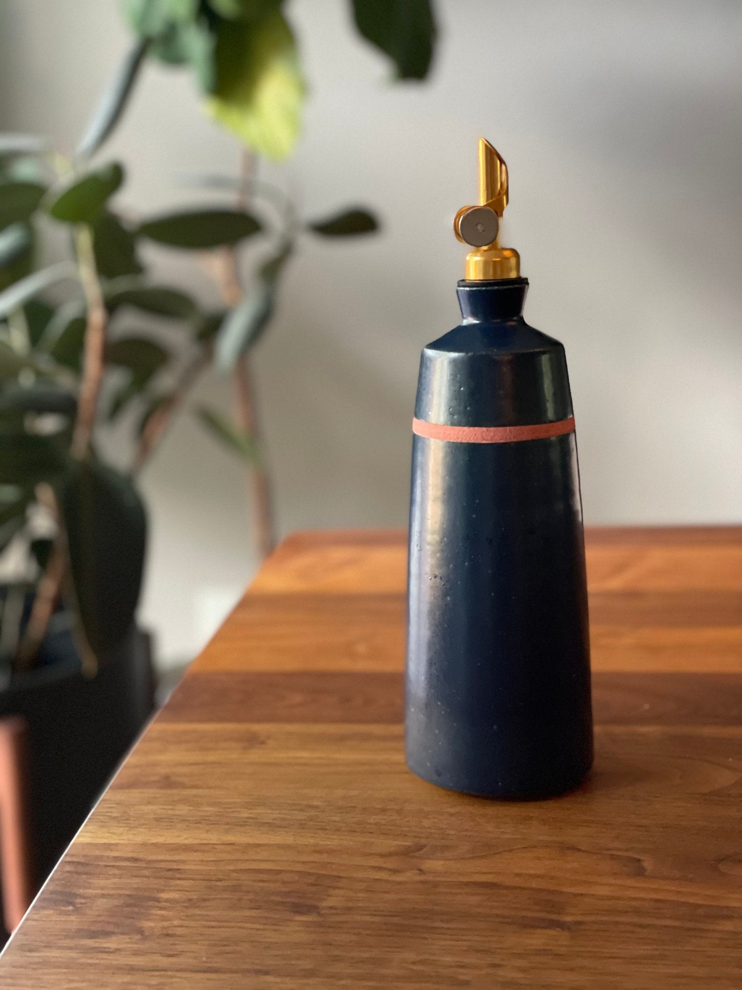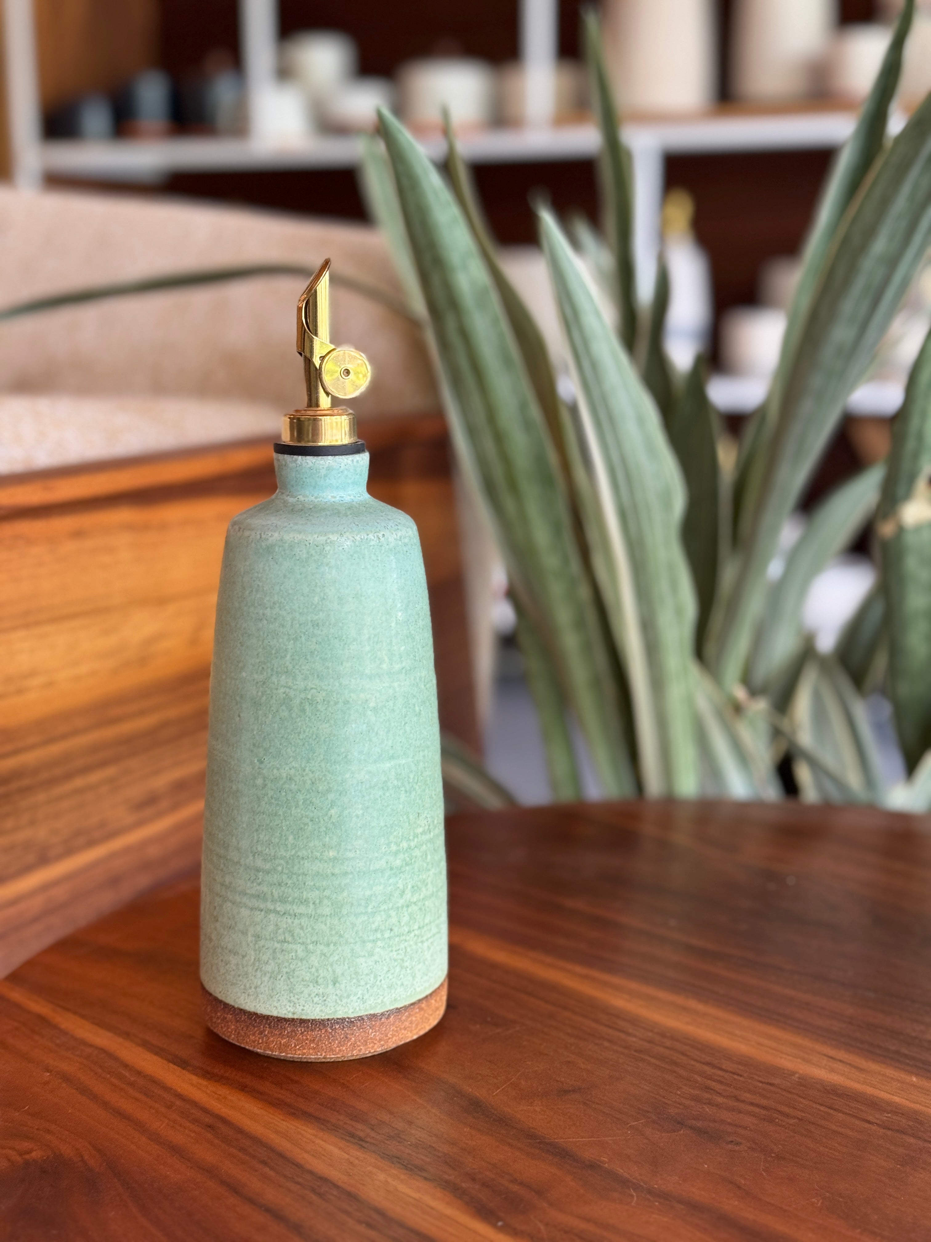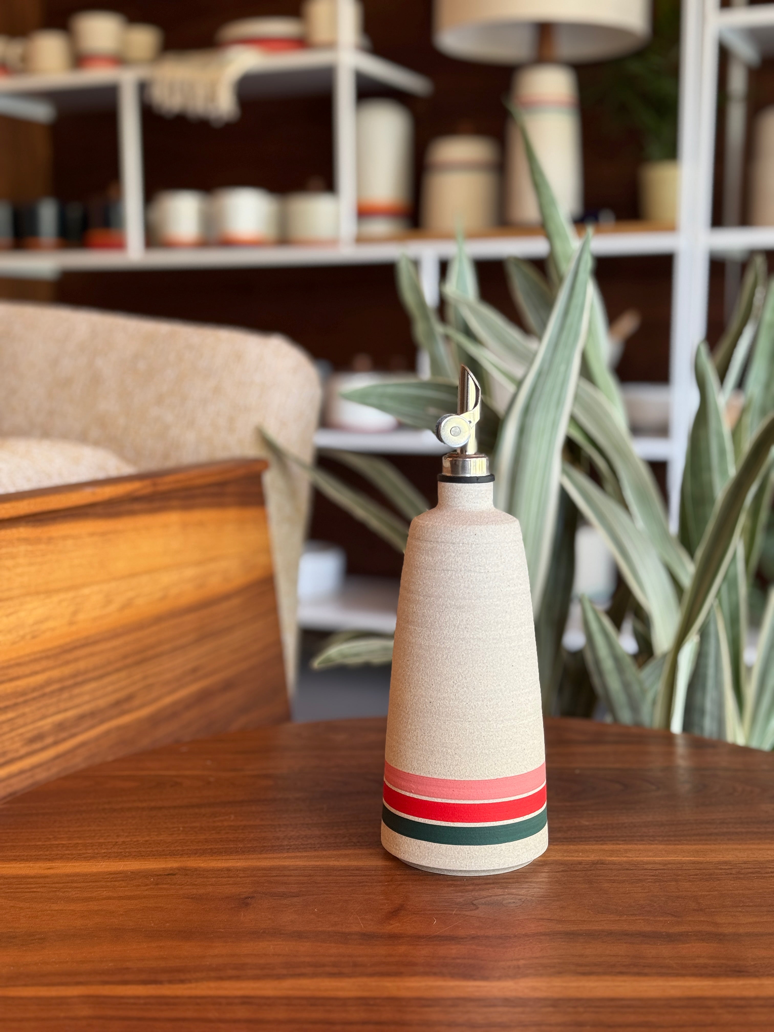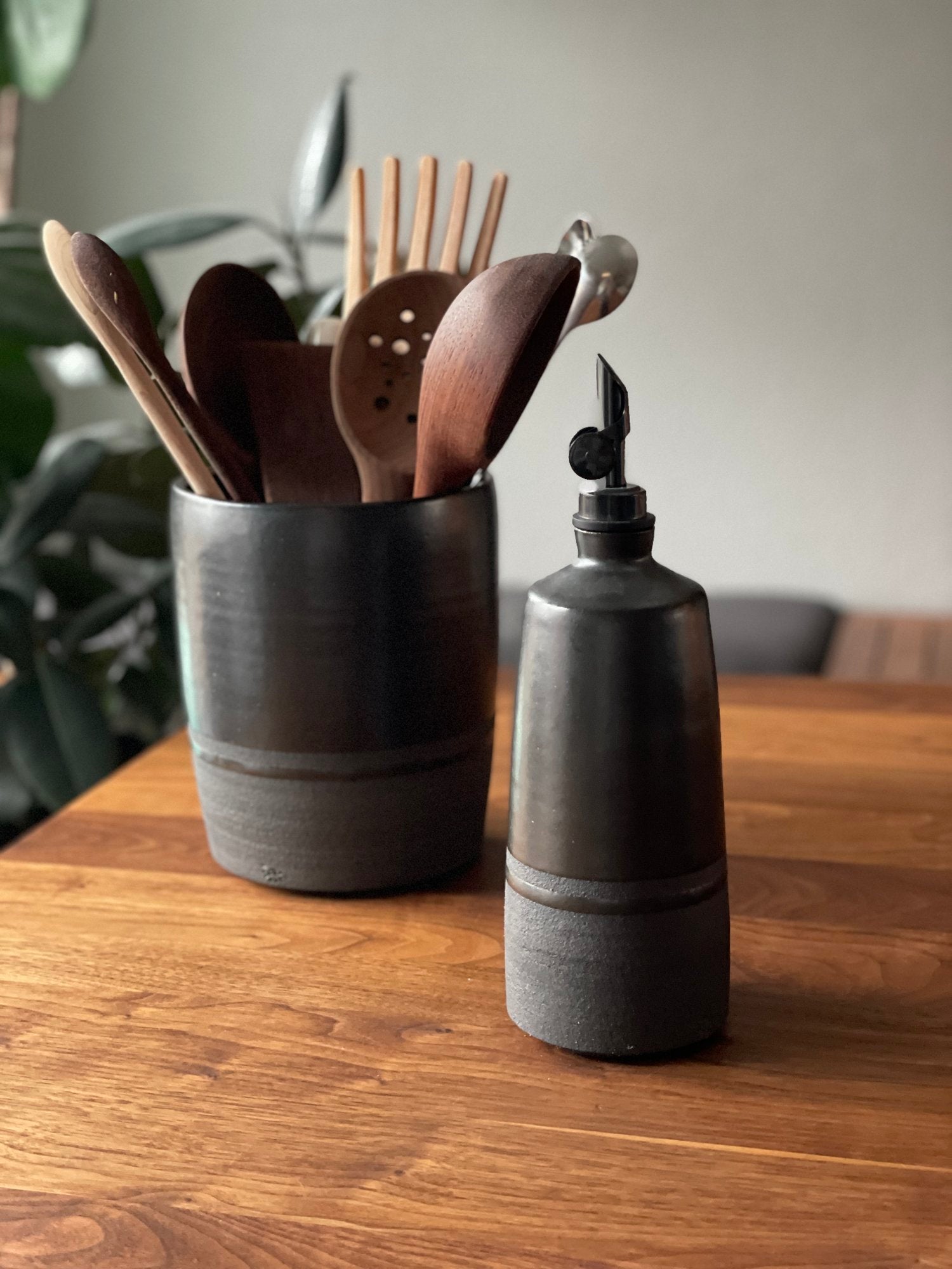 The perfect addition to any cooking routine. Made by hand on the potters wheel, this modern ceramic oil pourer is ideal to keep your oil, vinegar, or simple syrup fresh and easy to use. Microwave and dishwasher safe.