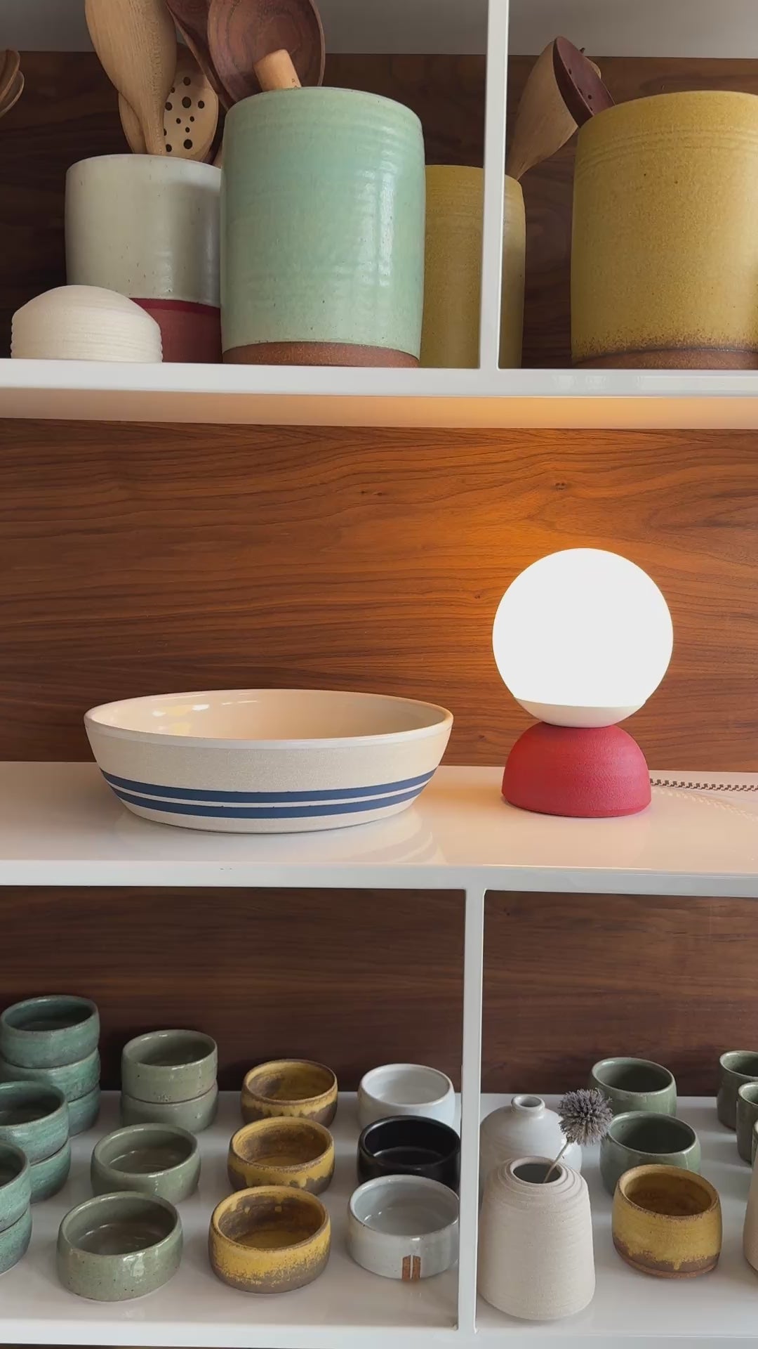 Our smallest and most whimsical lamp. These are all about adding a little pop of style to any desk or shelf. They include an in-line dimmer switch to adapt to any mood. Hand thrown on the potters wheel in Colorado.