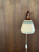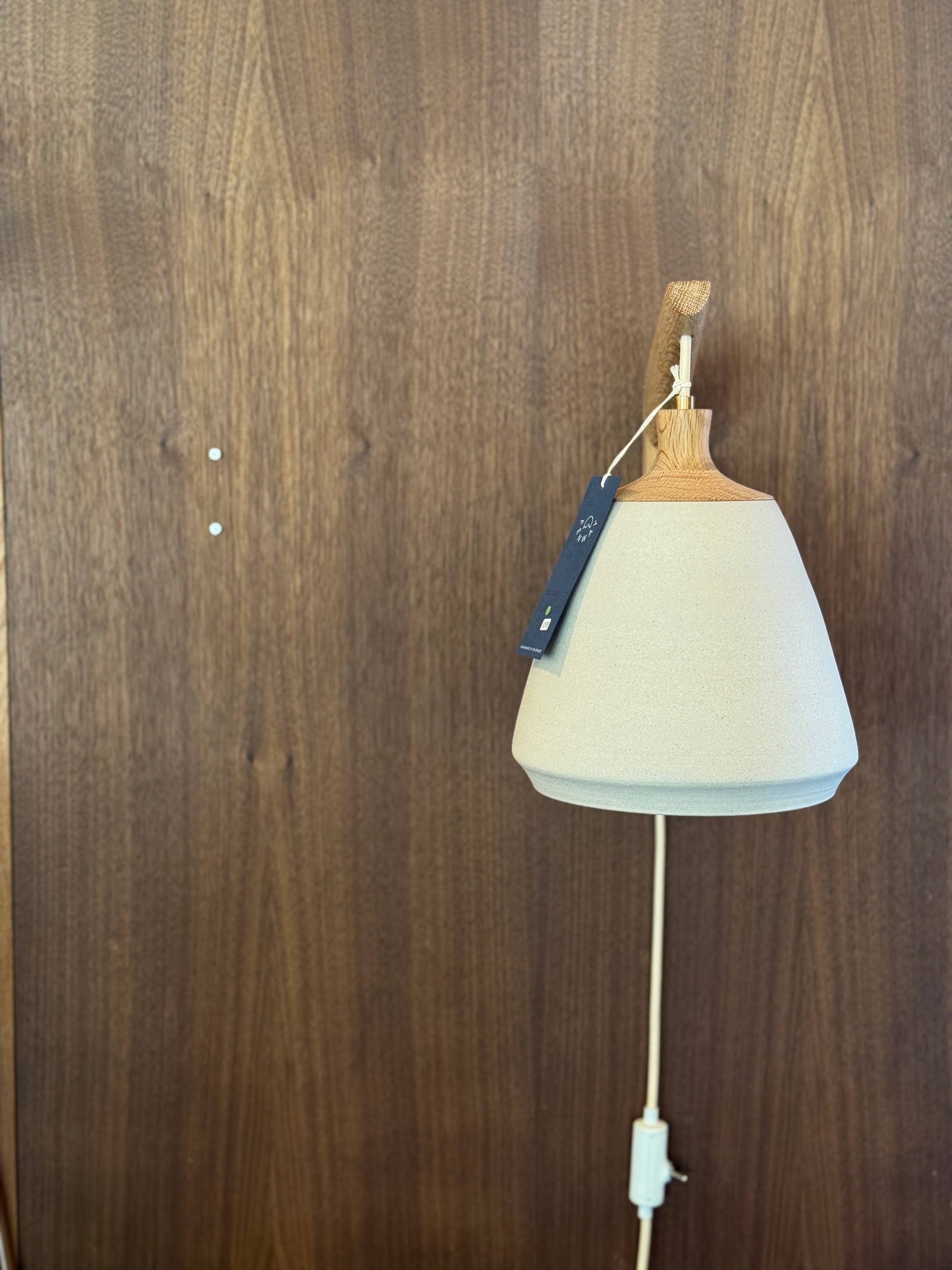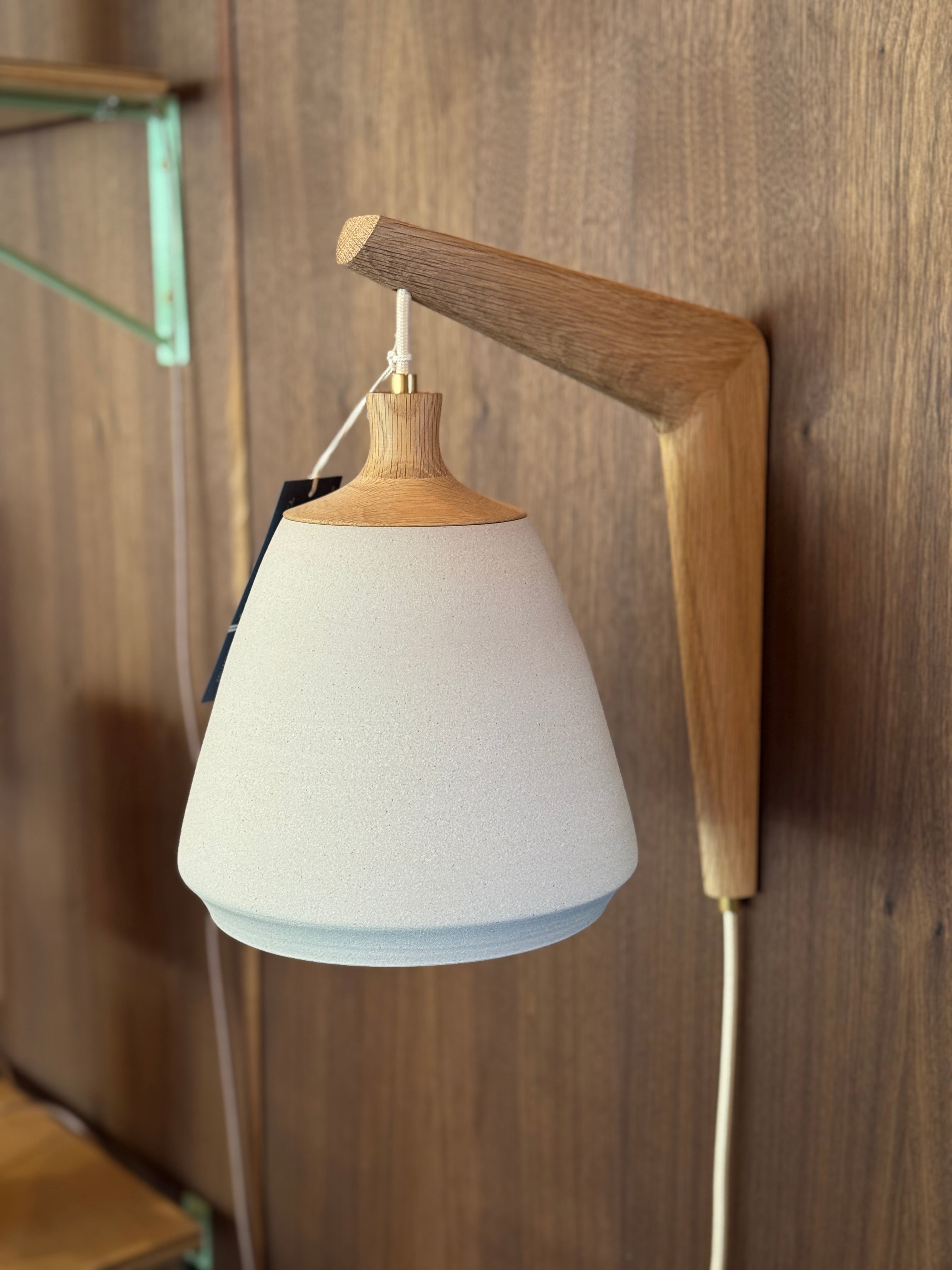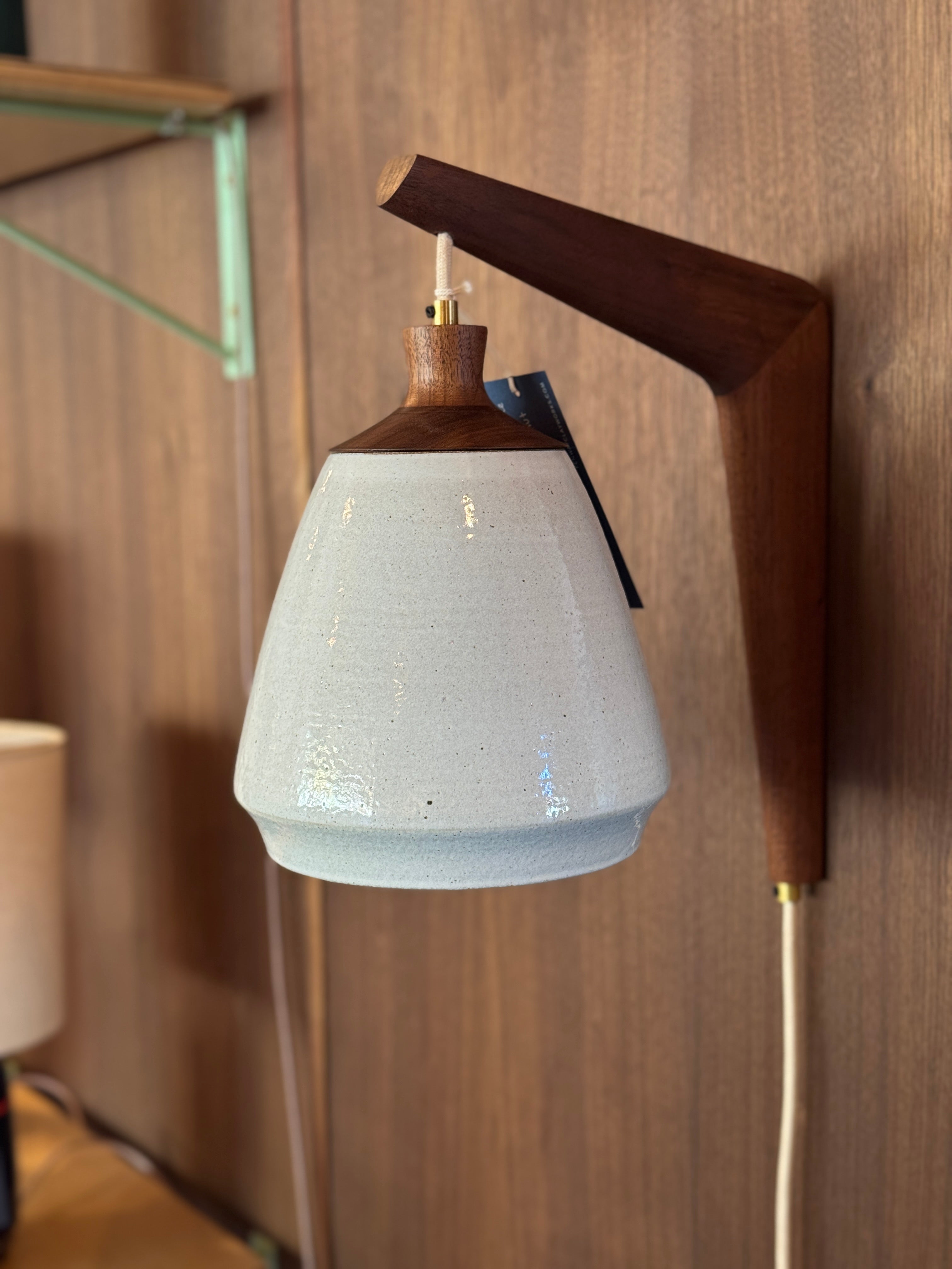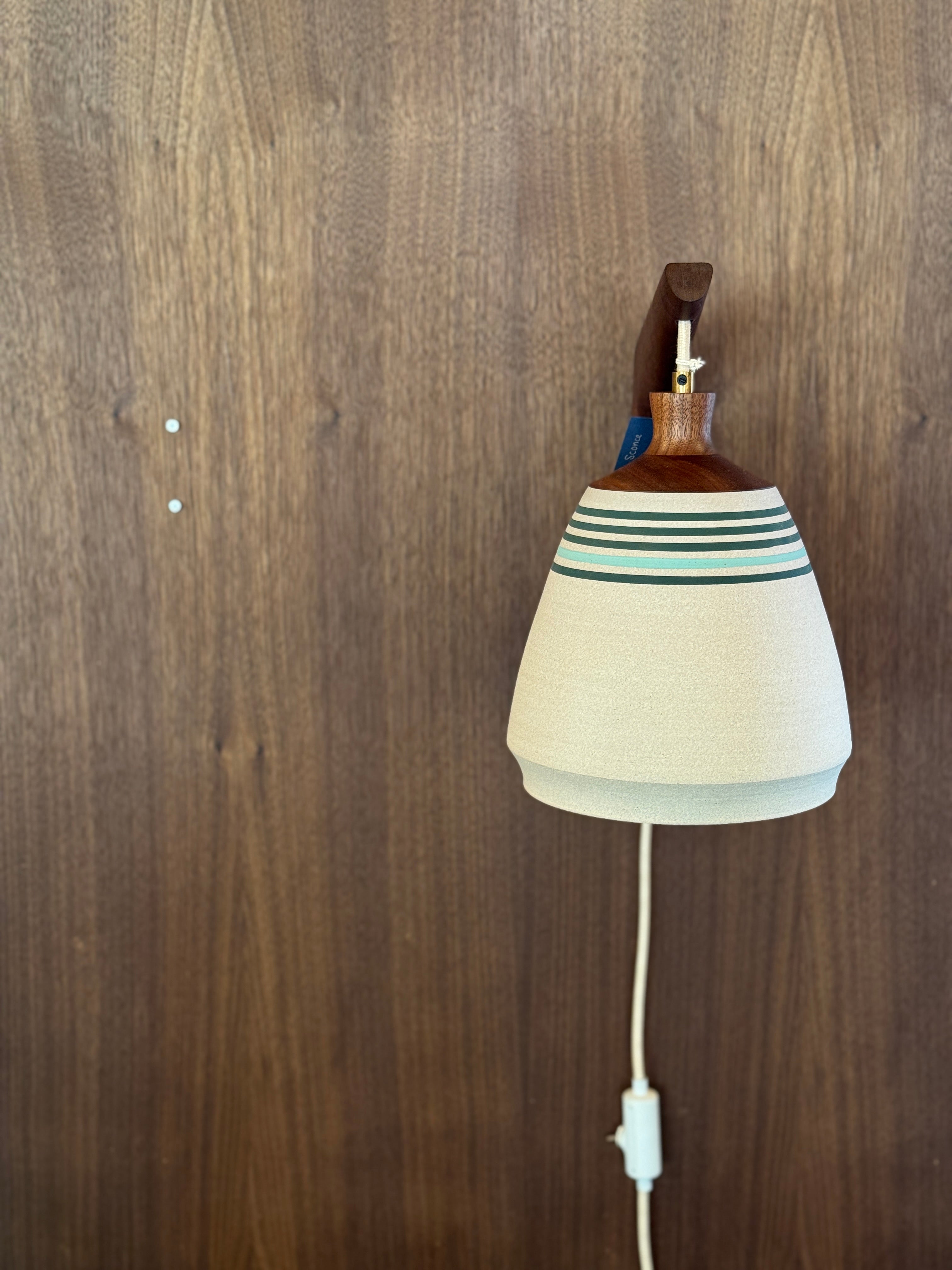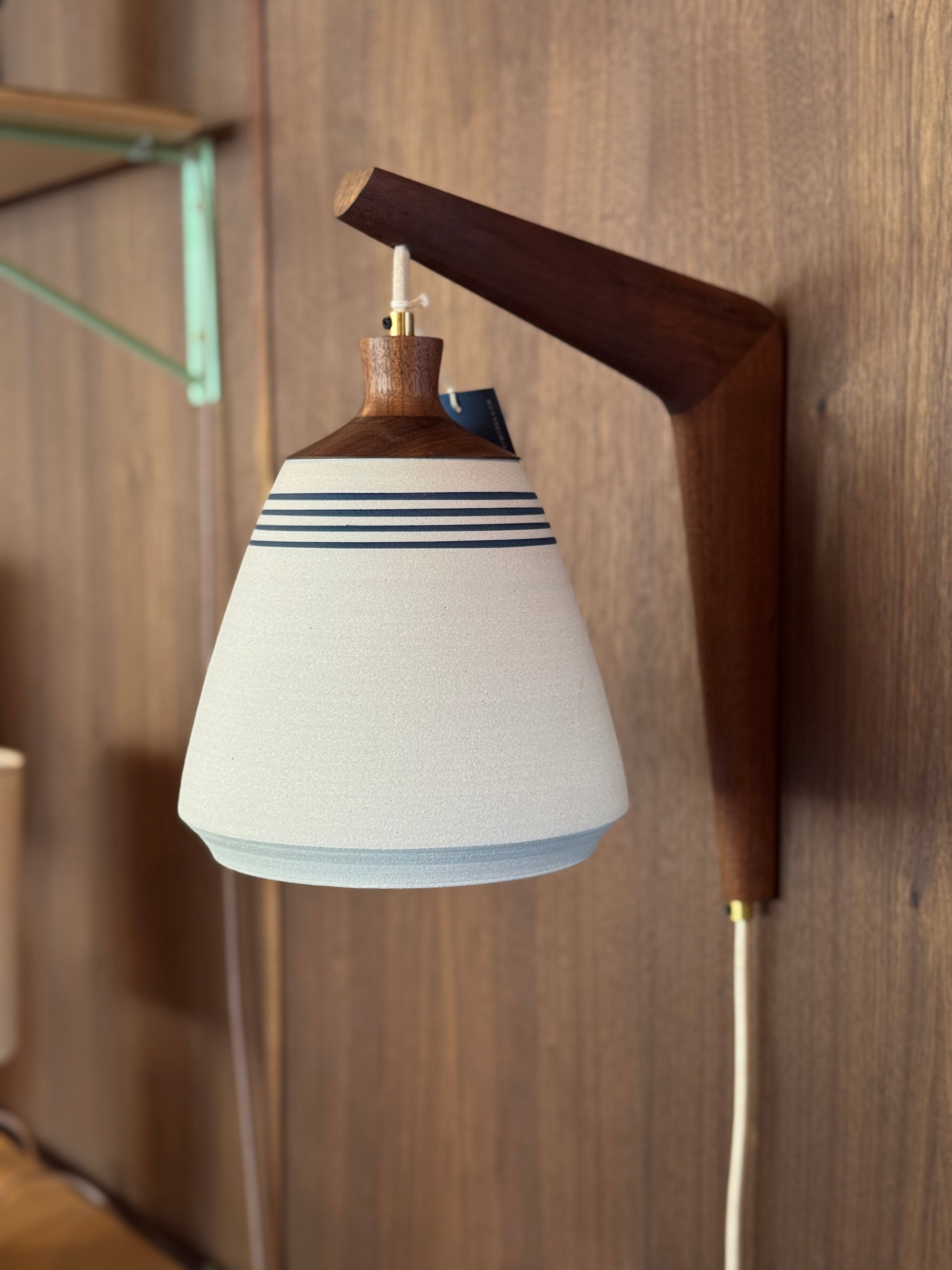 This wheel-thrown stoneware sconce is finished with a solid walnut, handmade mount. A fabric wrapped cord and inline on/off switch completes this sculptural fixture.
