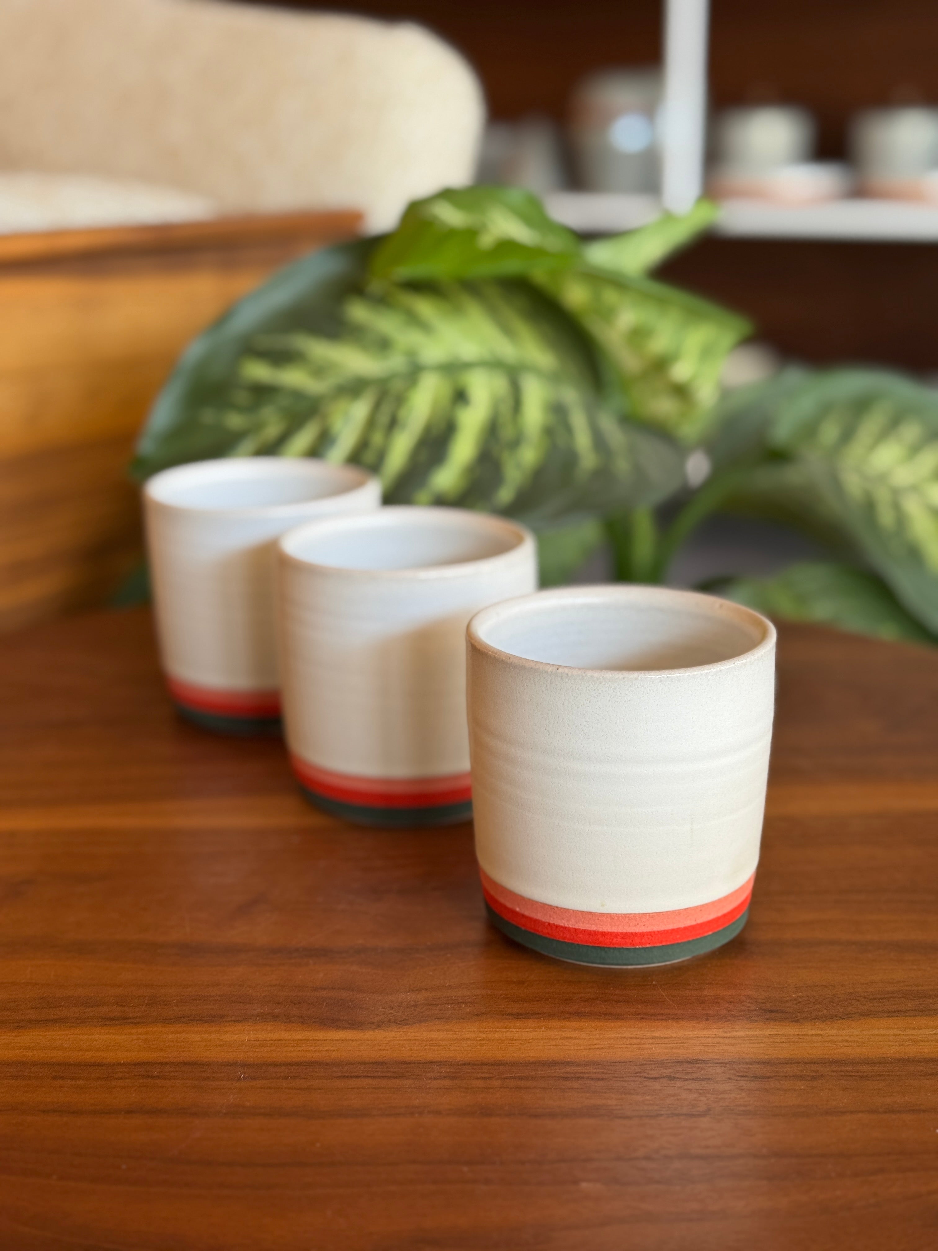 Our most classic tumbler form. Each piece is hand-thrown on the wheel in our Colorado studio, and finished with unique glazes that we've developed over many years. As always we do our best to keep each piece as uniform and tidy as the last, but small differences that occur throughout the handmade process are something we celebrate.