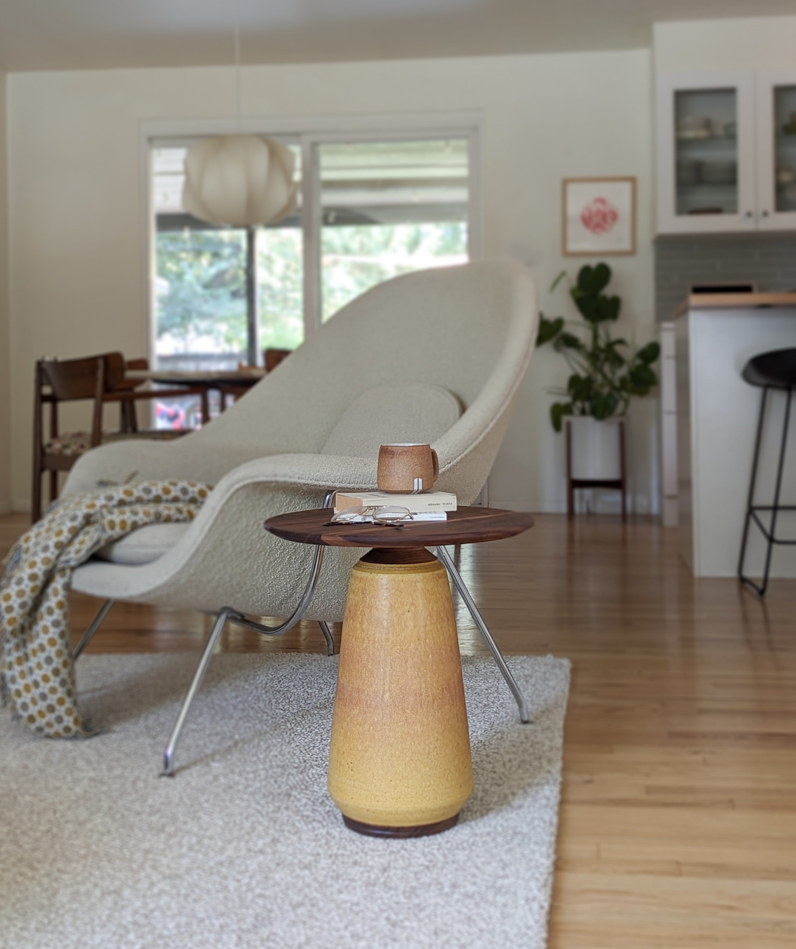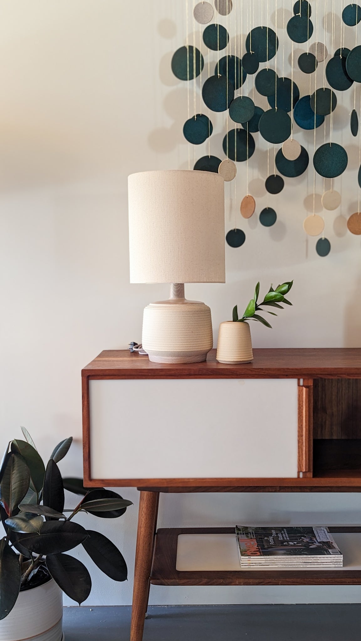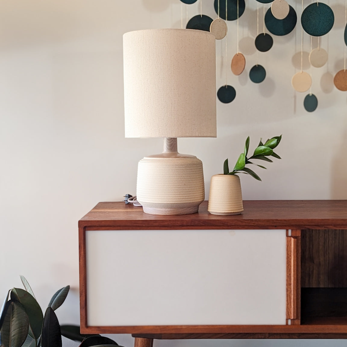 After the ceramic lamp or jar is completed, it is finished with lathe-turned wood components, perfectly crafted to match the form of it's ceramic counterpart.