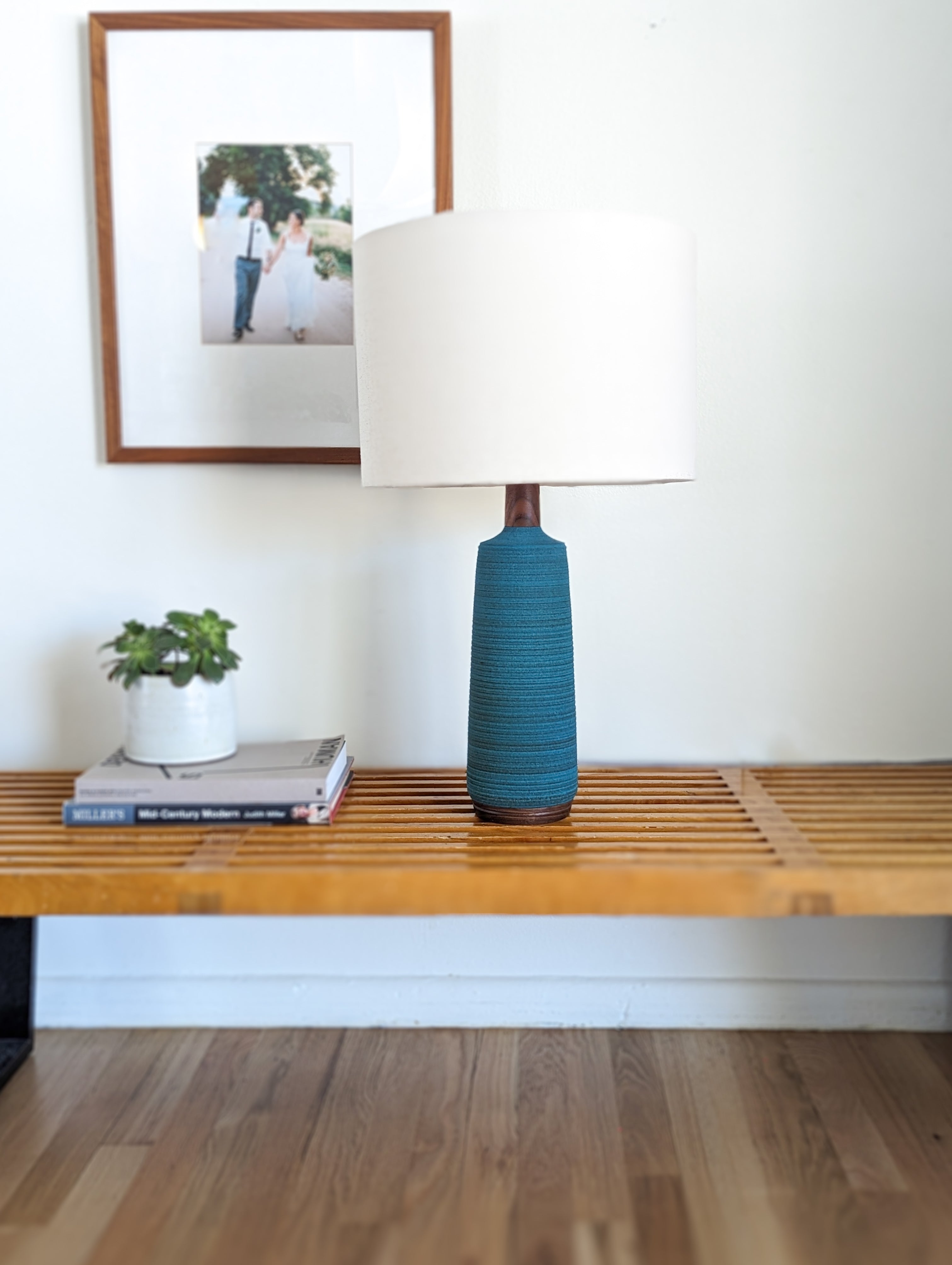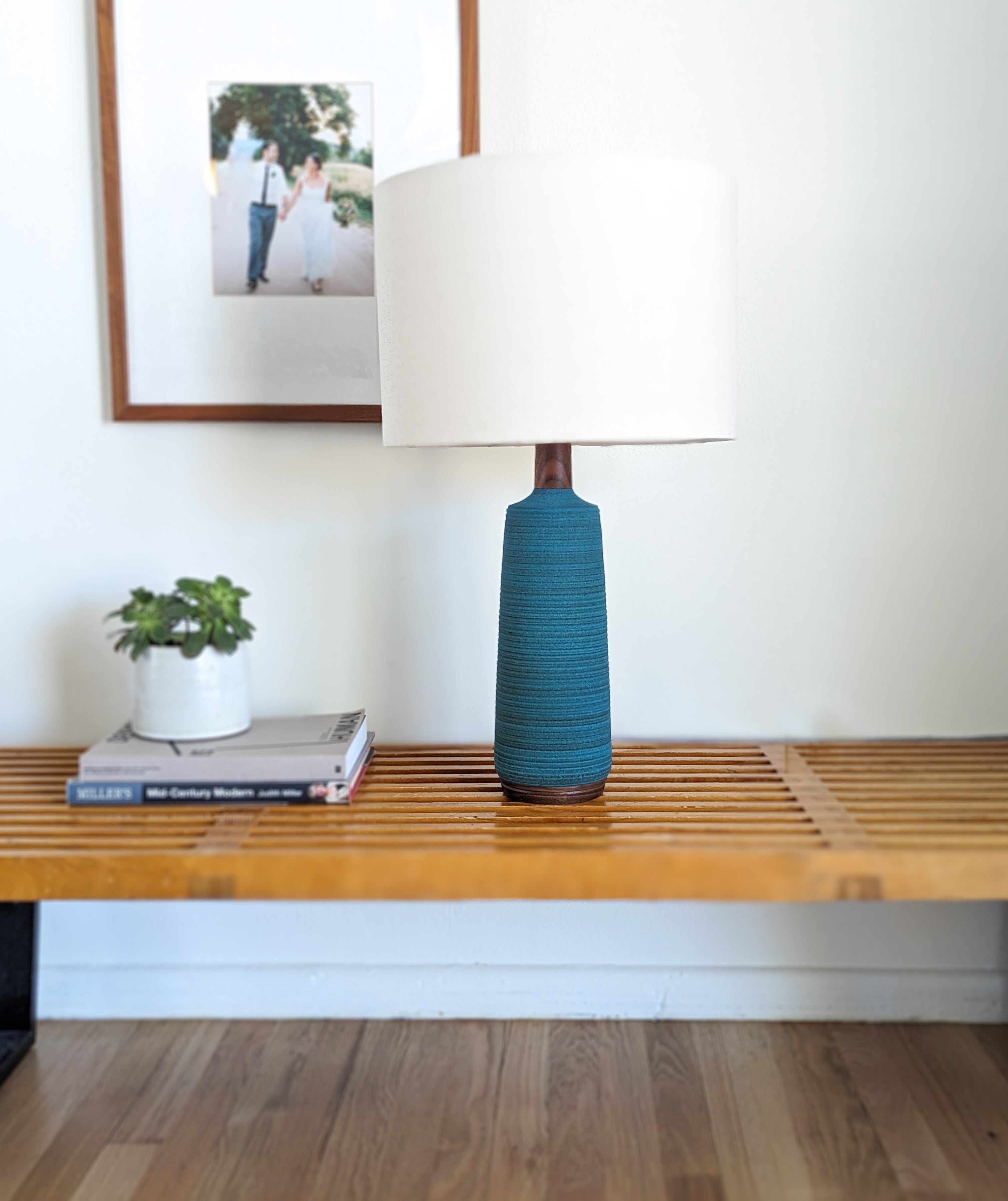 Lamps are assembled and fitted with harps, hand-turned wood finials, hand-made shades, fabric wrapped cords, and dimmable LED bulbs.