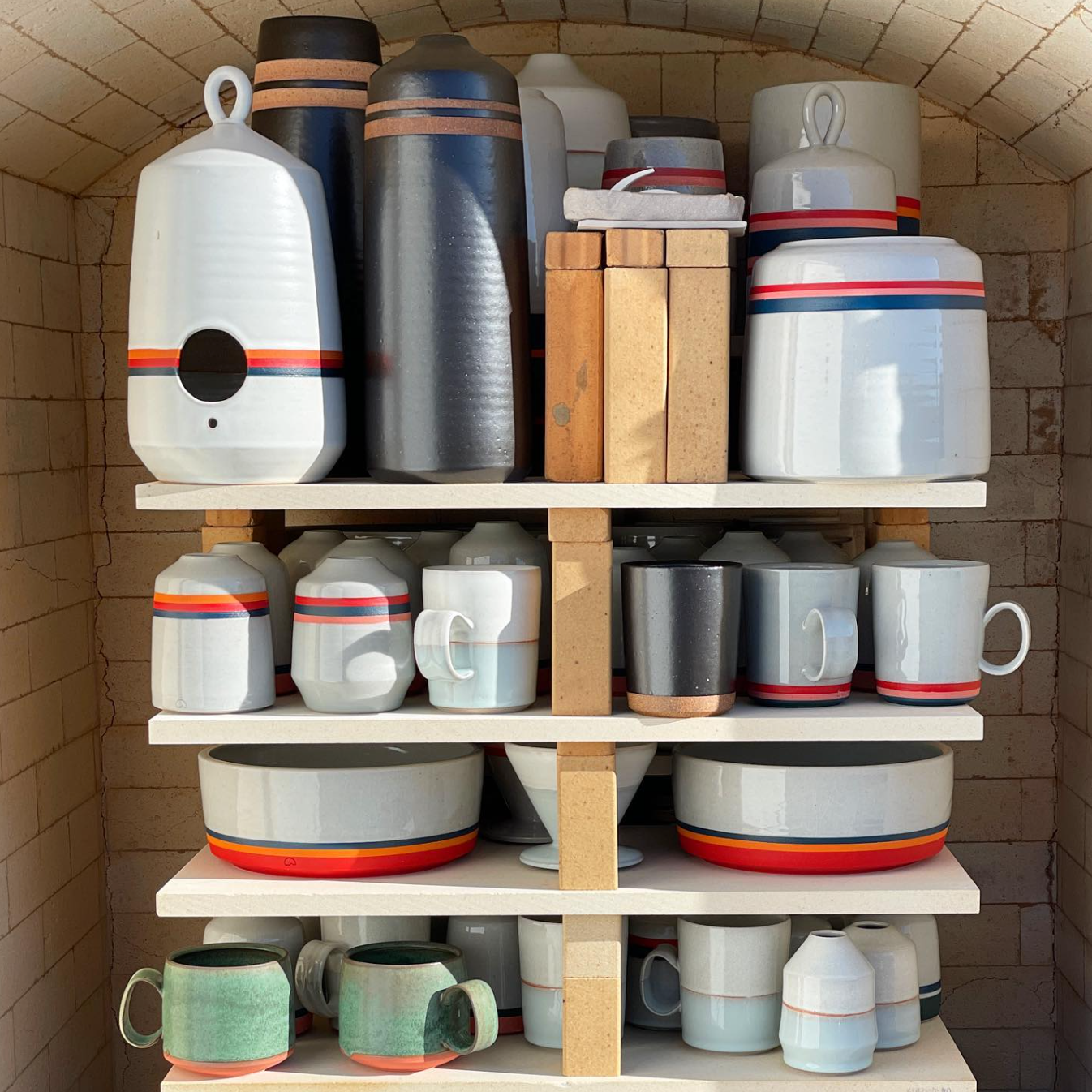 Pots undergo their next firing in a gas kiln at Cone 10, ensuring Fenway's vivid, saturated colors and a lifetime of durability.