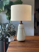 Sculptural and modern, this table lamp features soft curves and a detailed walnut neck and base.