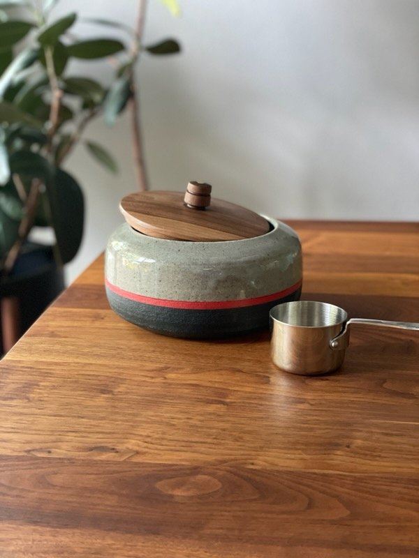 With a soft form and muted colors, this low and wide canister is ideal for storing dry goods in the kitchen or stashing things away on open shelves or any other space in the home.