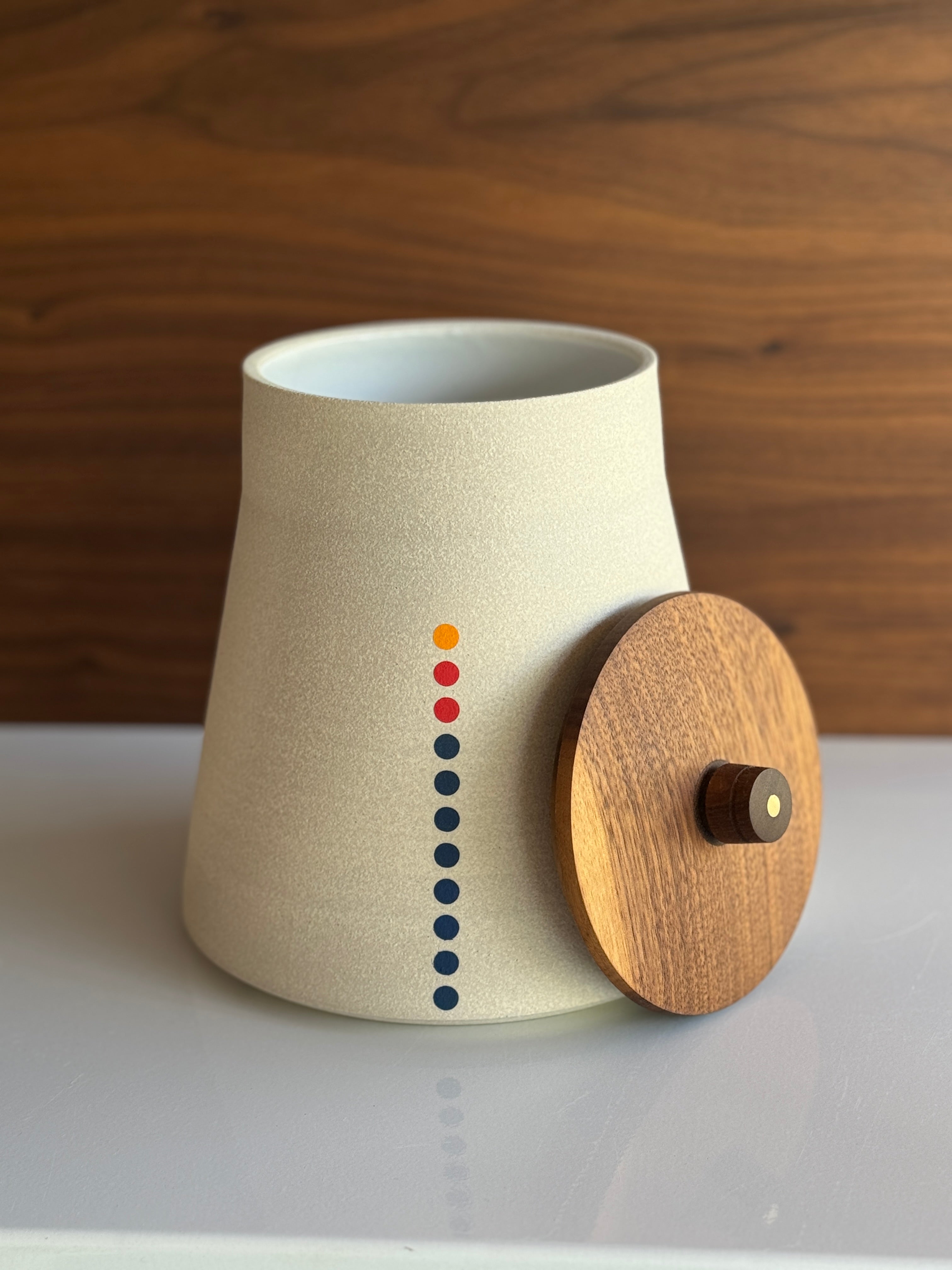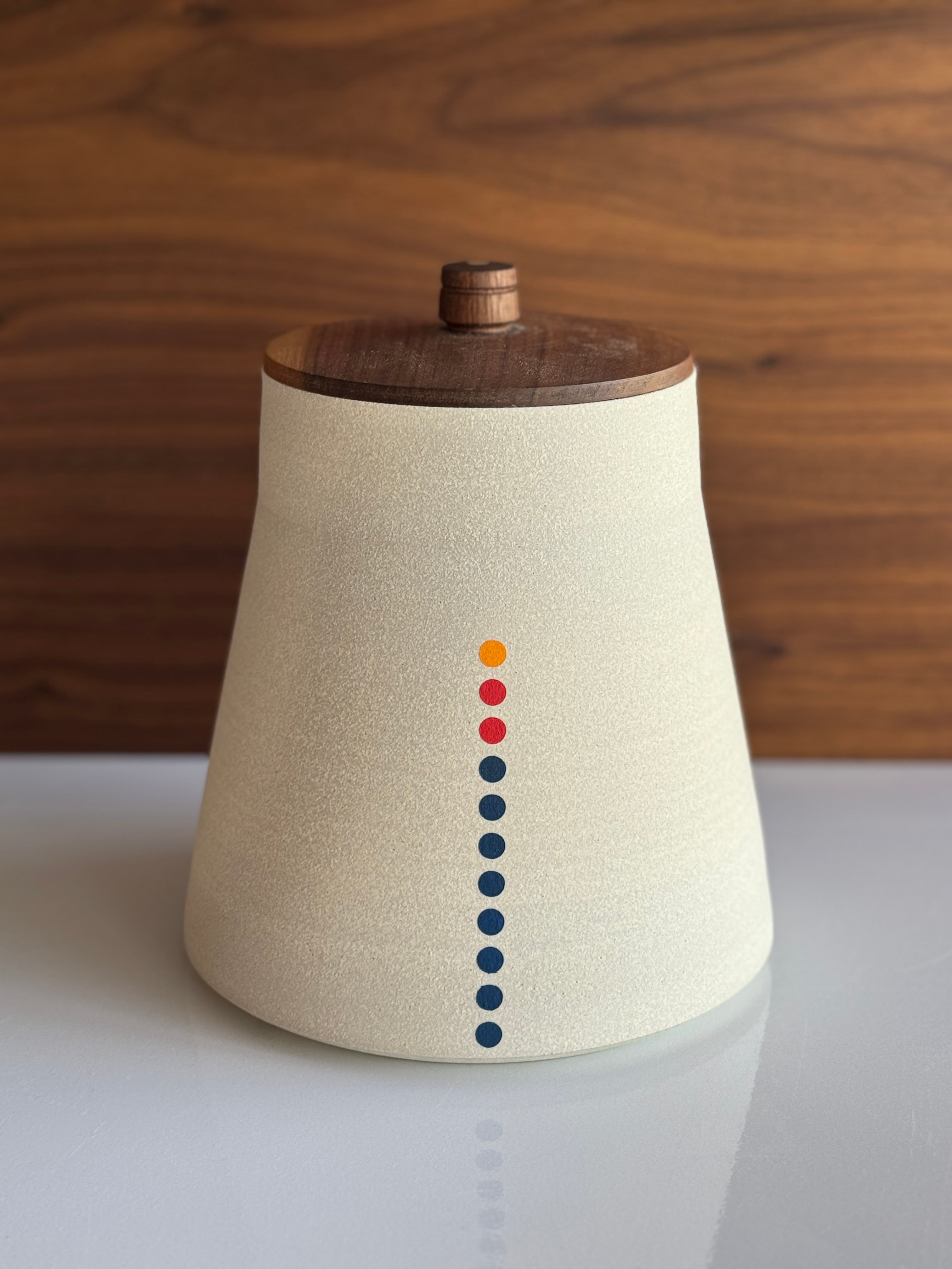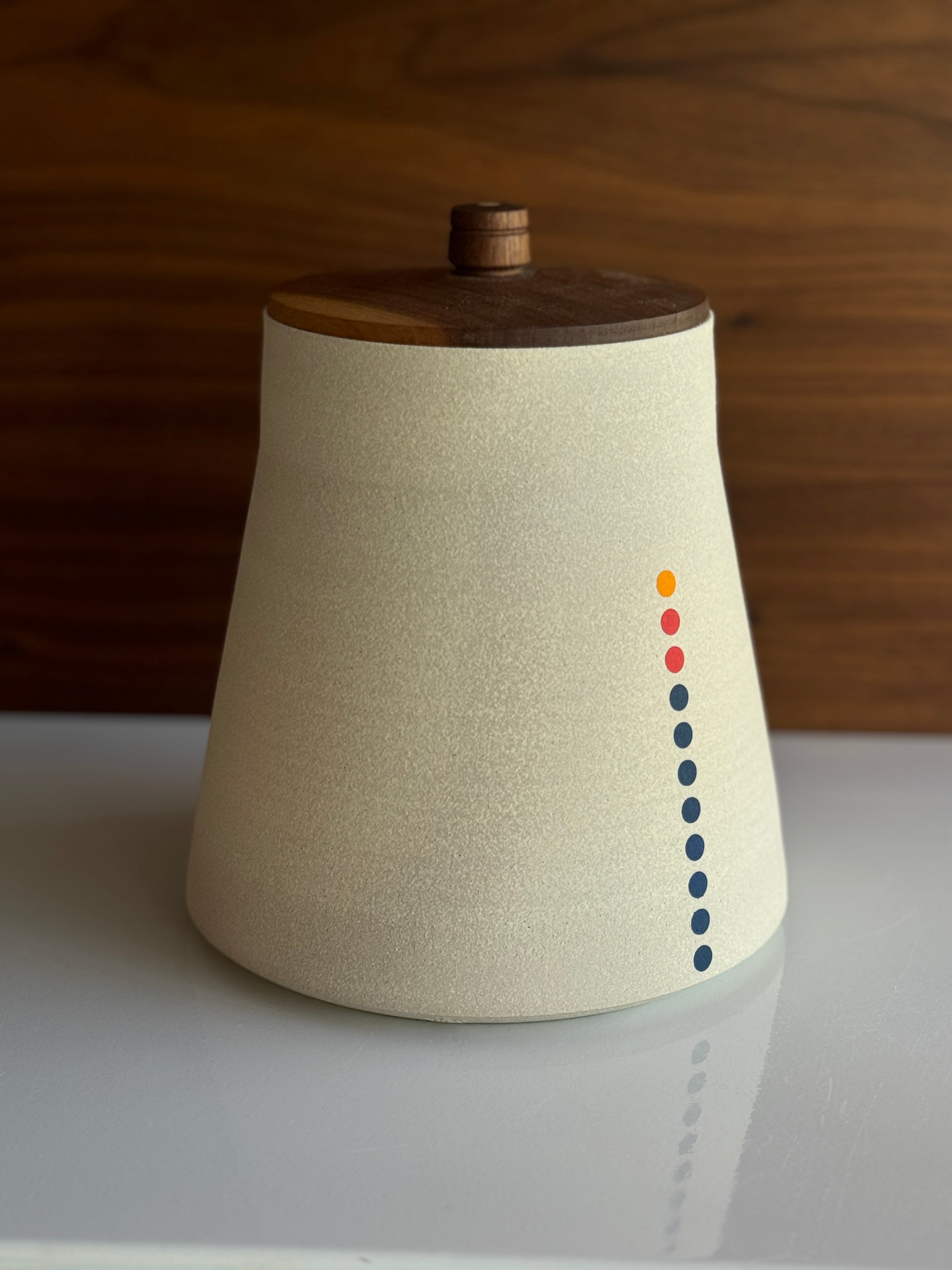 This large canister is ideal for storing dry goods in the kitchen or stashing things away on open shelves or any other space in the home. Finished in raw white stoneware with navy, red, and orange dots aligned vertically. The first jar in this new exploration of creating lines with circles. One of one.