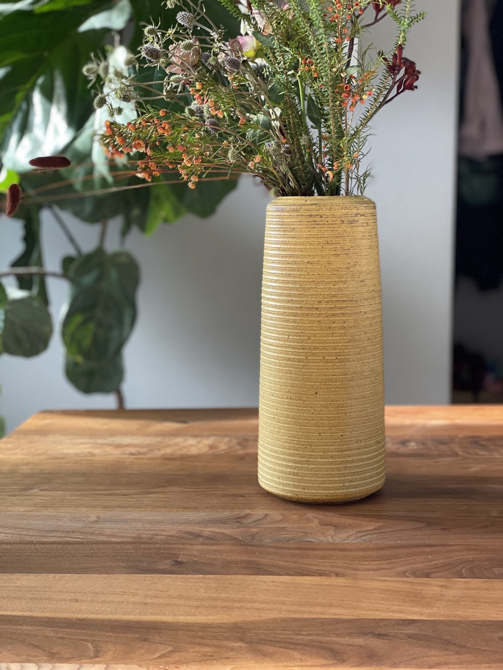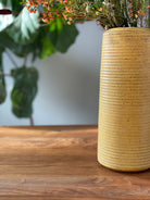 A large vase, versatile and textured, then finished in an earthy yellow glaze.