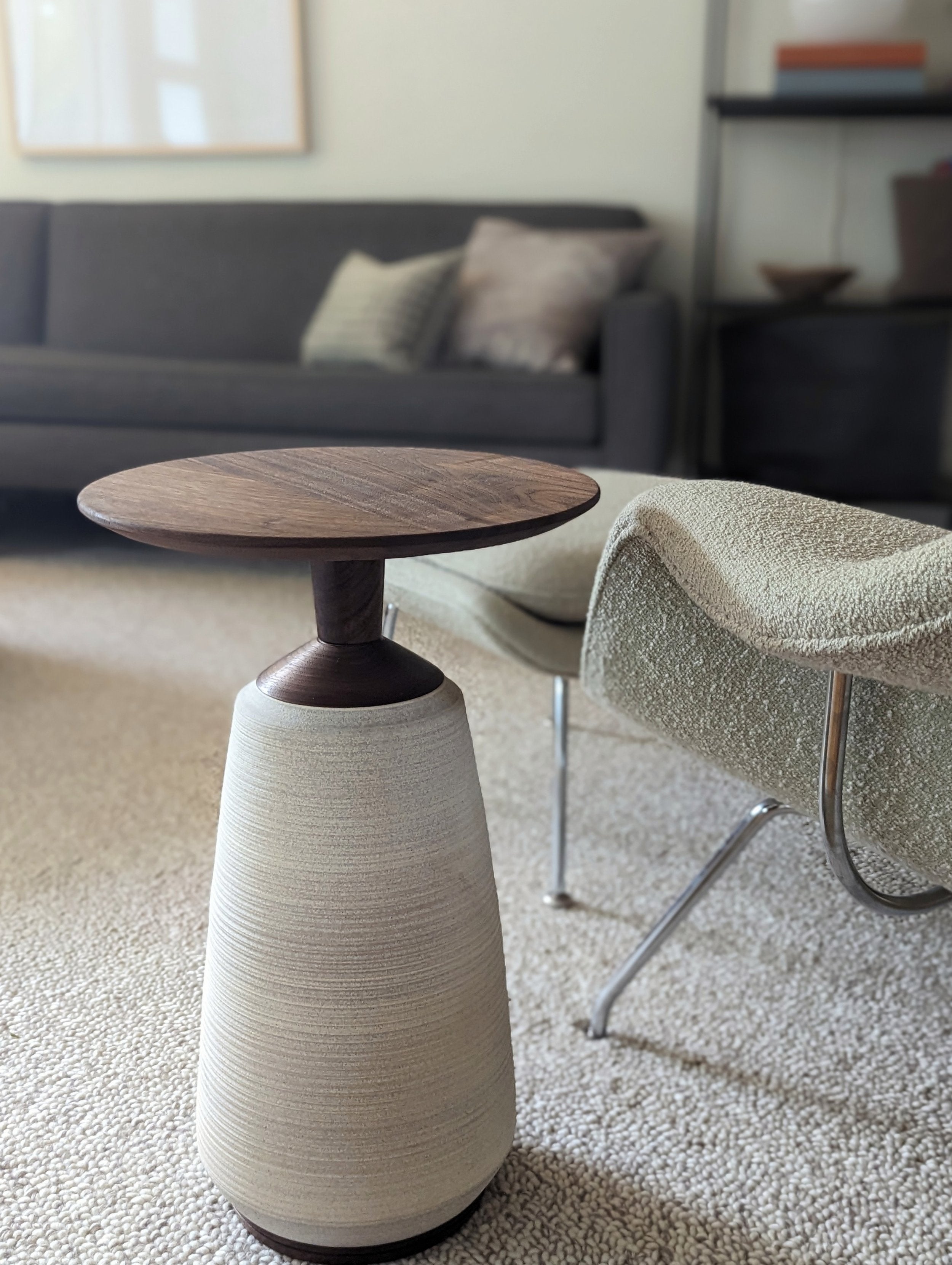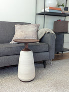 Created of hand turned solid wood tops, neck, and bases, then paired with hand-thrown ceramic base. These tables are show-stopping accents in the home.
