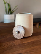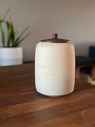 This large canister features a smooth stoneware exterior, ideal for storing dry goods in the kitchen or stashing things away on open shelves or any other space in the home.