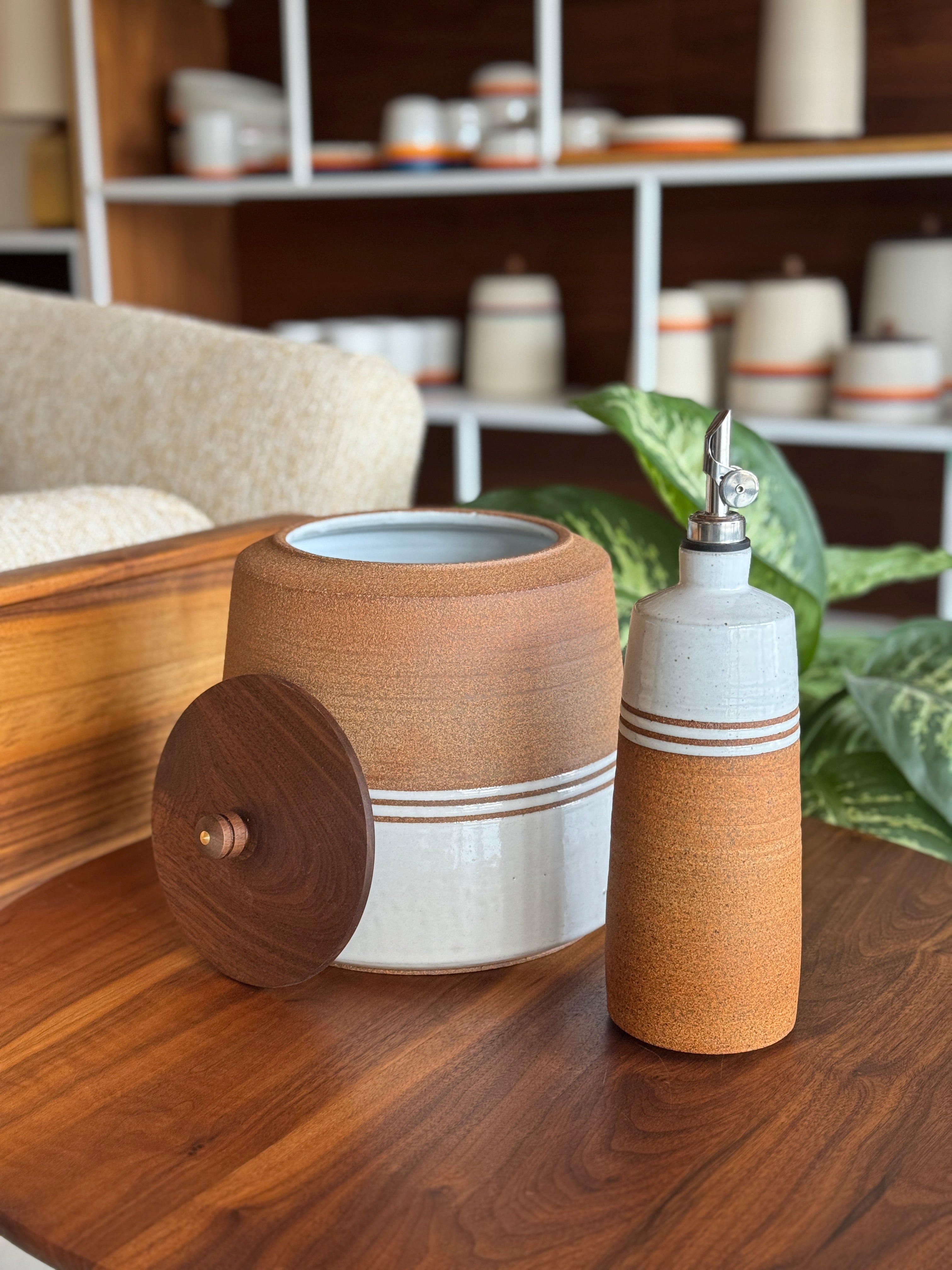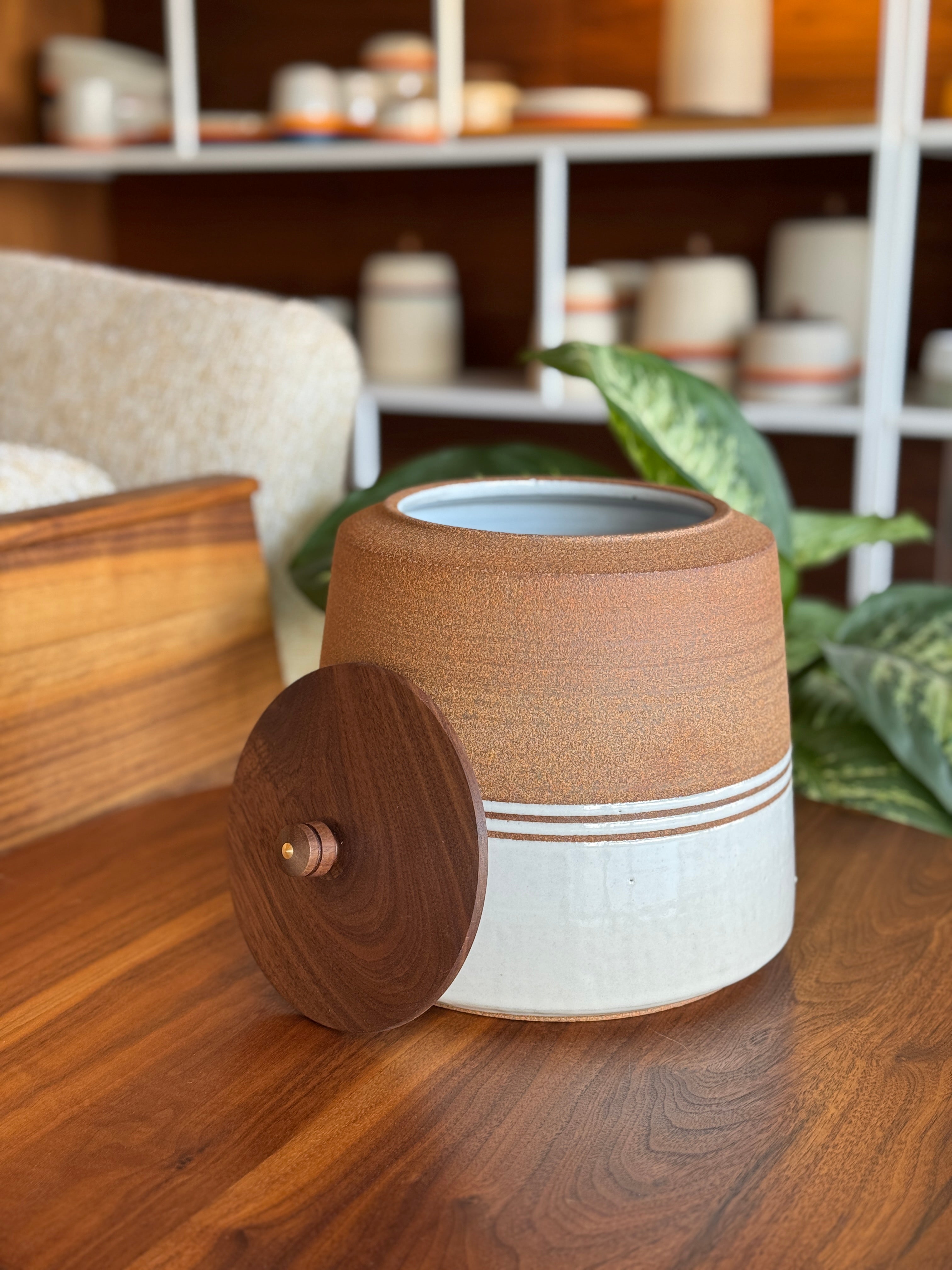 With raw ceramic and white glaze, this modern canister is a statement piece for your home. Functional to stash away household items or utilize for dry goods and treats in the kitchen.